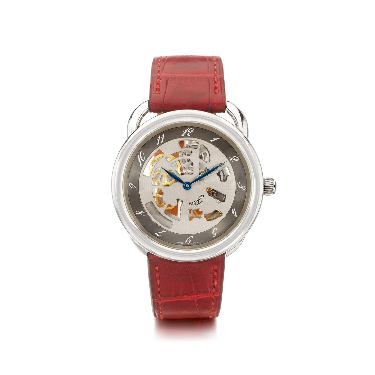 Limited edition of 171 pieces to celebrate the 30th anniversary of the Arceau family, with automatic movement, stamped 32 jewels, skeletonized design dial with transparent case back, with signed red alligator leather strap and buckle, mounted in 18K white gold, case measures approximately 40 mm, signed Hermès, numbered, with Swiss assay mark, international hallmark for gold and maker's mark.