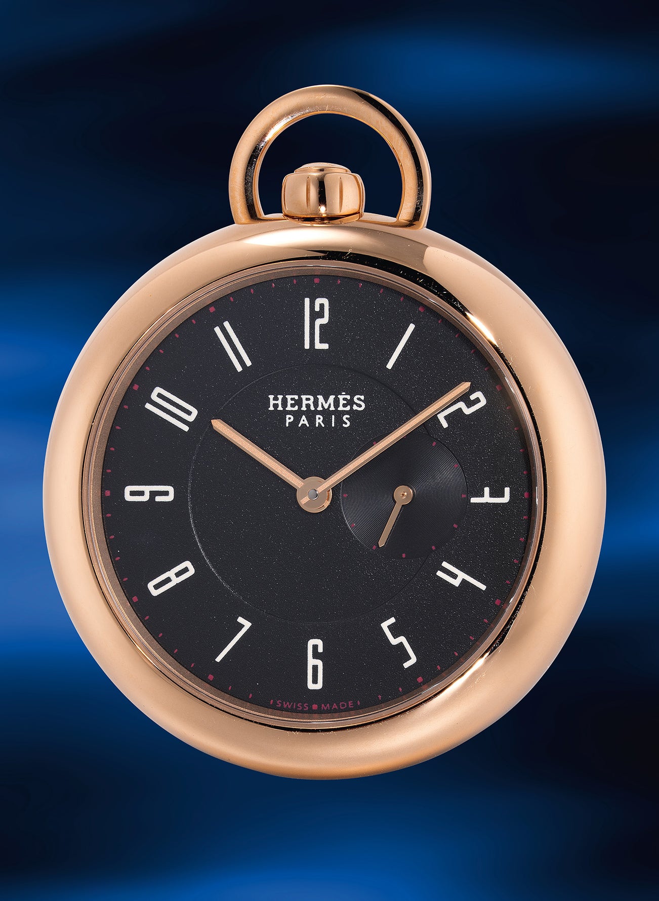 This unique and iconic model now returns in a rose gold composition, clad in a H red Swift calfskin. A pocket-watch that may be transformed at will into a wristwatch, it embodies both the historical leatherware craftsmanship of Hermès and its watchmaking development to the point of becoming a full-fledged Manufacture.