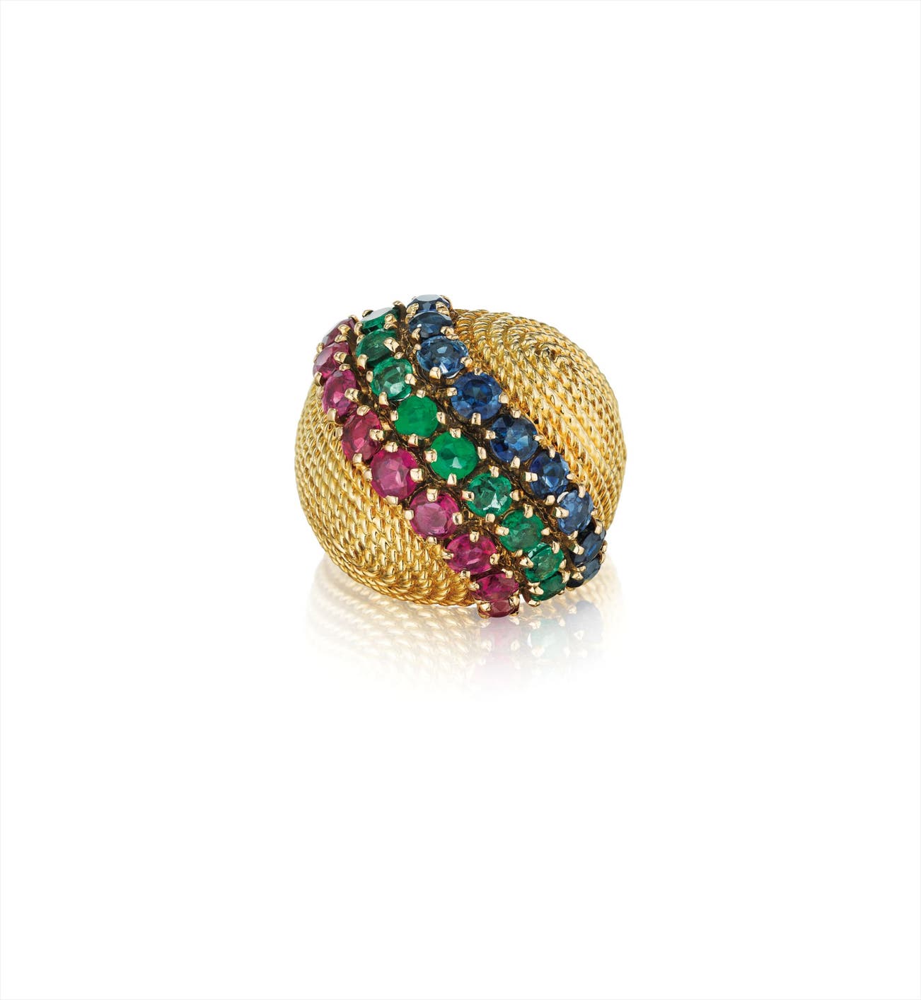 Of textured bombé design, centrally enhanced by three rows of circular-cut sapphires, emeralds, and rubies, mounted in 18K yellow gold, size 5.