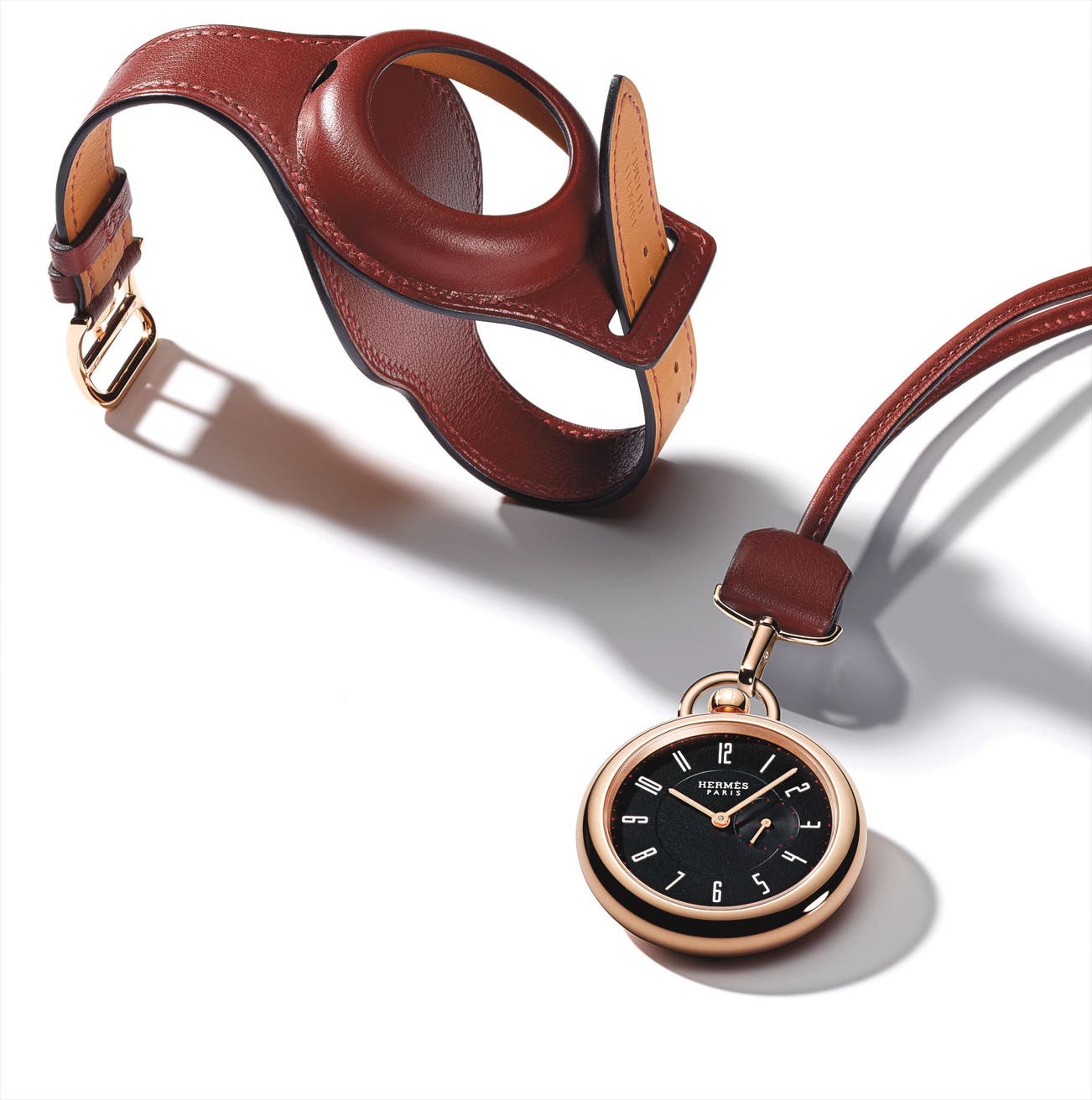 This iconic model now returns in a unique rose gold composition clad in a H red Swift calfskin. A pocket-watch that may be transformed at will into a wristwatch, it embodies both the historical leather hand craftsmanship of Hermès and its watchmaking development to the point of becoming a full-fledged Manufacture.