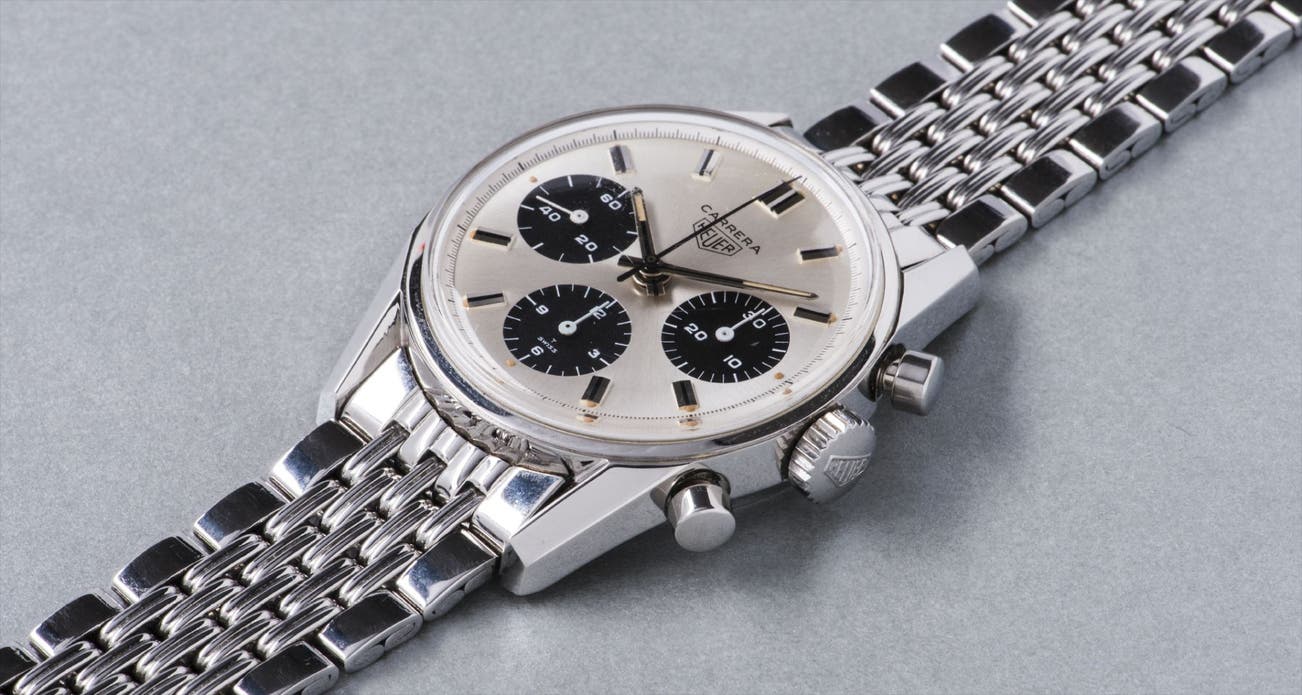 One of Heuer's most iconic designs, the Carrera reference 2447 SN is a superb example of the sleek and sporty chronograph watches produced by the brand during the 1960s. With powerful faceted lugs, a thick case and round pushers, the reference 2447 was manufactured from 1963 until approximately 1970.