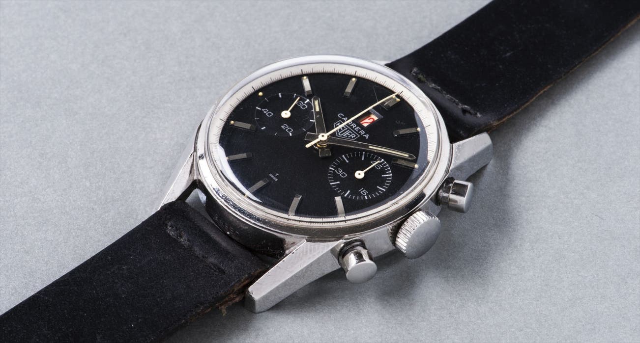 The Heuer Carerra reference 3147 also called "Dato" (because of the date feature) was launched in 1966, with a totally original and unusual positioning of the date at 12 o'clock. The first execution featured the date at 12 o'clock, but the fact that the chronograph seconds hand covered the date, most probably lead Heuer to soon move the date from the 12 o'clock to the 9 o'clock position. Interestingly, even though associated with the world of motor sports - the name Carrera is a tribute to the Carrera Panamericana, an automobile race on open roads in Mexico that ran from 1950 to 1954 and considered the most dangerous and deadly of car races at the time - the minutes counter records up to 45 minutes rather than the habitual 30 minutes and is more in line with the timing of halves of a football match than that of fuel injected automobiles racing at ground-breaking speed on asphalt. The present lot will appeal to the chronograph enthusiast in general and the Heuer aficionado in particular due to its particularly fierce look with bold bevelled lugs, its stealthy, all black dial highlighted by the white chapter ring and the striking contrast of the red date disc.