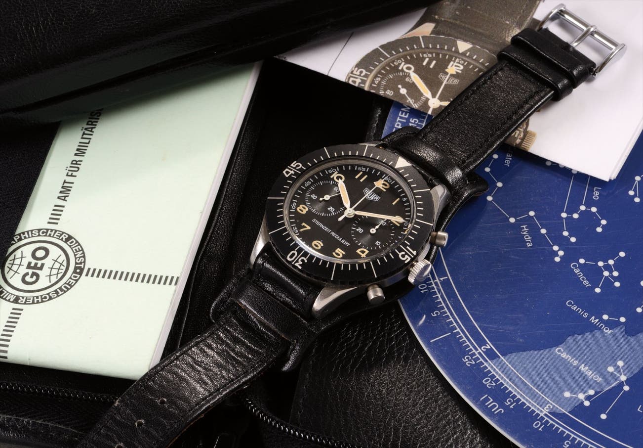 Heuer’s Bundeswehr flyback chronograph watch was made for the German military from the 1960s until the early 1970s. The brand manufactured the watches to meet the specifications required by each branch of the force, and therefore there are several variations of the model available. The present example is the rare “Sternzeit Reguliert” model, which rarely appears at auction. The designation “Sternzeit Reguliert” printed at the bottom of the dial is German for “sidereal time”. This is the method to tell time based on the earth’s rotation in relationship to a distant star and not the sun. A sidereal day lasts 23 hours and 56 minutes.