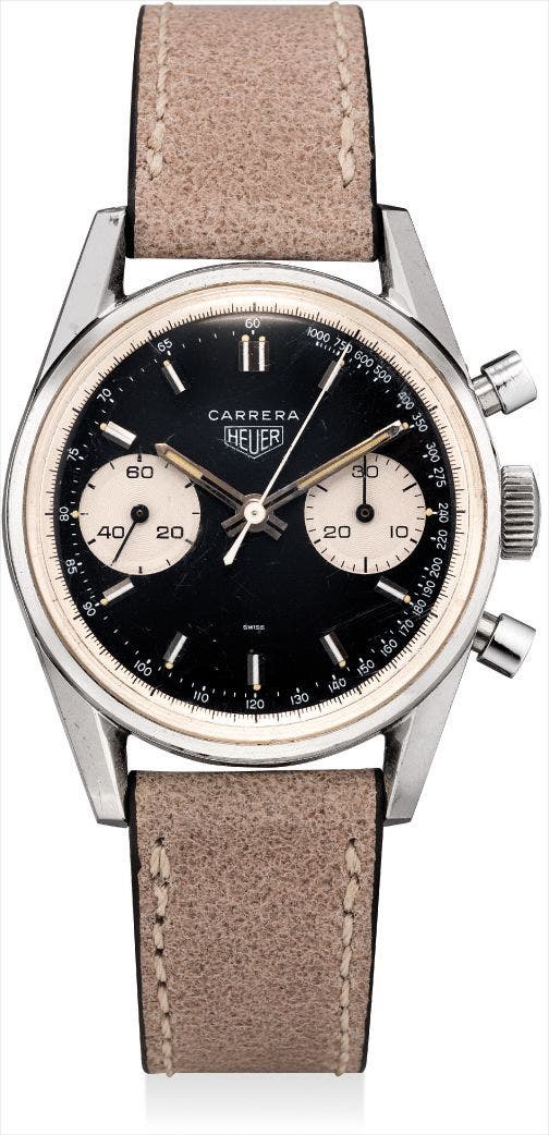 Legibility was the most important factor for Jack Heuer when he masterminded the cult model "Carrera". Fitted with the famous Valjoux 7730, the present watch is fitted with a "NST" dial, featuring a black background with white two-subsidiary registers. The watch furthermore displays a tachometer scale, which is quite rare for this reference.