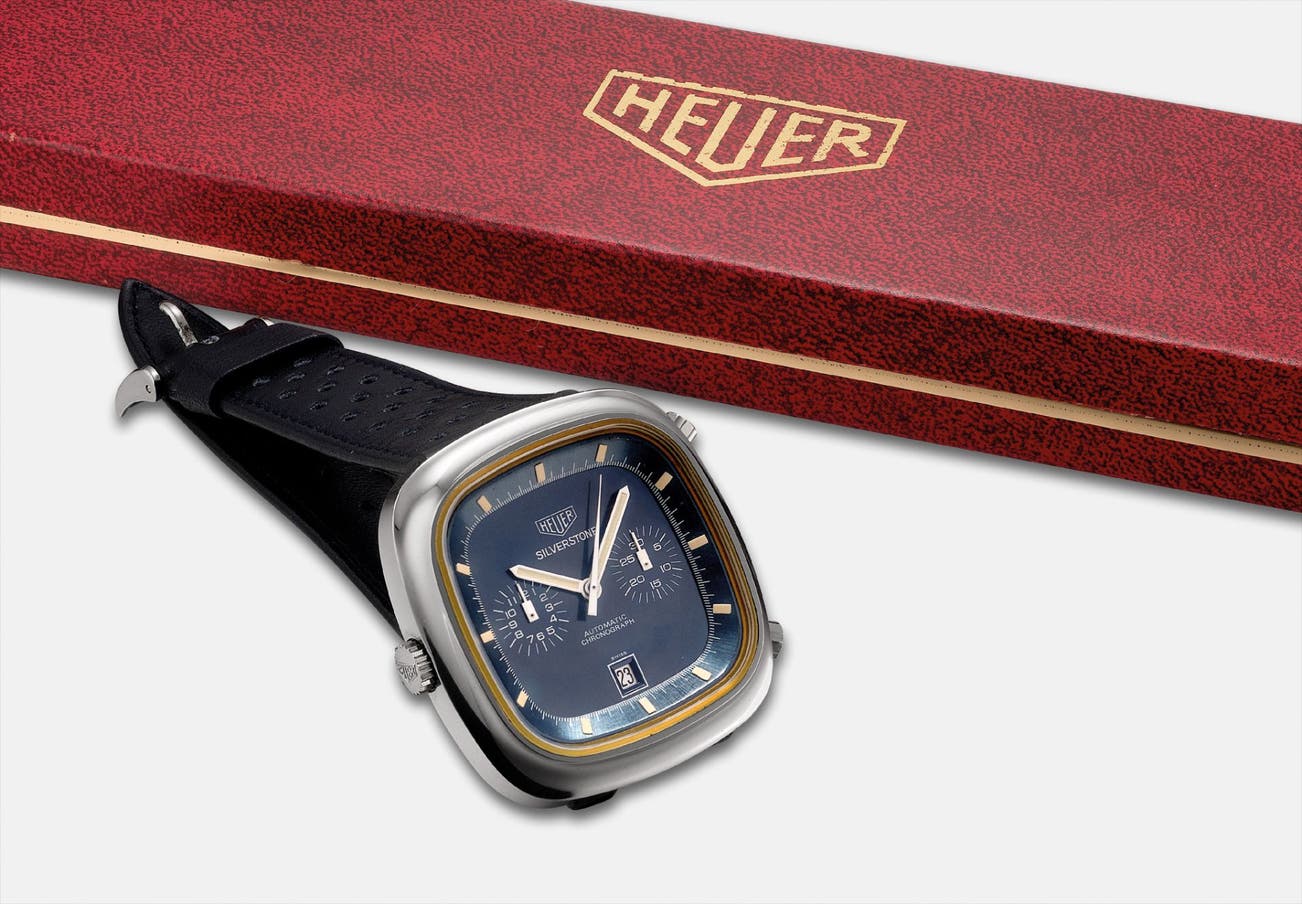 The Silverstone was launched as the replacement for the Heuer Monaco, which was not a commercial success for the manufacture at the time of production. Reference 110.313B is characterized by the blue dial, which displays different tones. Due to the watch's automatic movement, Heuer placed the crown on the left side of the case, meaning the wearer never had to wind the watch. The present watch is preserved in like new condition with its factory sticker to the case back, and is enhanced by the presence of its sales tag and fitted presentation box.