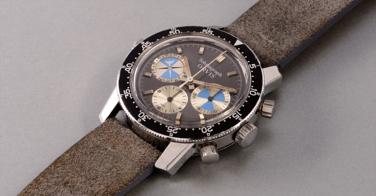 Over time, numerous models of the “Seafarer” were manufactured and by the 1970’s the outdoor retailer Orvis commissioned their own model named the Solunagraph. While Heuer sold the model through both Abercrombie & Fitch and Orvis, the brand also retailed it under their own brand with the model name Mareographe. The Solunagraph’s valjoux caliber 72 movement is housed in a case with a compressor-type snap on back and sports a black bezel calibrated to 60 minutes for divers. The present lot, from the first series with polished steel hands, is in wonderful overall condition with two round chronograph pushers in the band, with a third push button on the left-side of the case, used to set the moon-time dial. Fitted in an oversized case measuring 40 mm in diameter, it is a wonderful addition to any collection of rare chronographs.