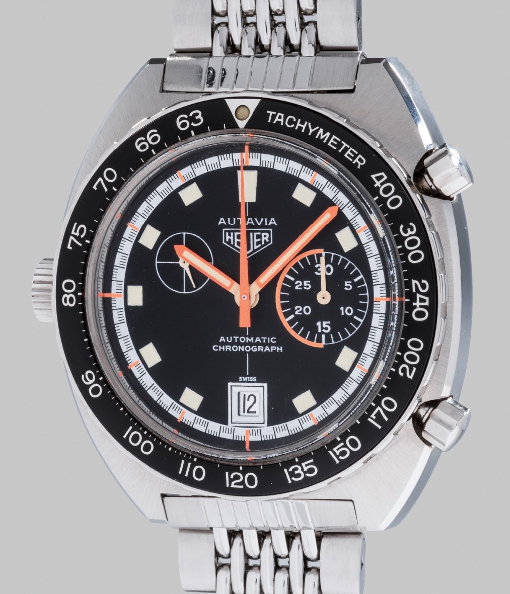 Rapidly, this model garnered an important following amongst the Heuer enthusiasts who nicknamed it the “Exotic Dial”. This model launched in the early 1970s, had a dial unlike any other within the Autavia family: large luminous markers, checkerboard style hash marks for the 1/5-second track, hands and semi-circle around the minutes counter subdial in vivid orange and crosshairs for the running seconds register.