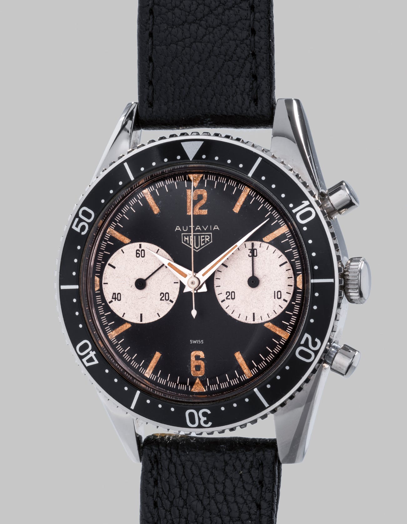 The dials of the 1st execution Autavia chronographs (made until about 1966) featured luminous markers and oversized numerals at 12 and 6 o’clock providing for a theatrical and visually arresting result. The present lot also has the particularity of having thin luminous inserts as used towards the end of the first batch of first execution reference 3646 Autavias.