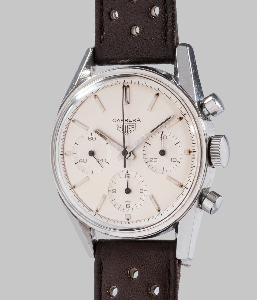 The present lot with its serene dial and refined case is more an ode to leisure driving on the winding roads of the Riviera than a fuel injected race at ground-breaking speed and will appeal to the collector looking for one of the first original Carrera models.