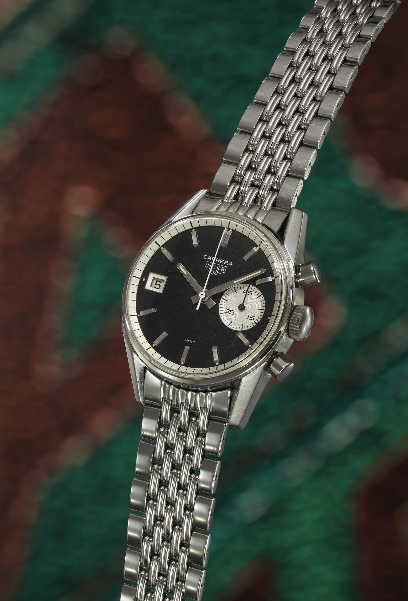 Introduced in 1968, reference 3147N is a second generation Carrera with date featuring a subdial at the 3 o'clock position and a date window at 9 o'clock. It is not known how many were ordered by the Jordanian Air Force, however, to date, only 5 have been documented but it is thought that the production run was of 100 pieces. A unique and interesting feature for this Jordanian Carrera is the widely spaced one second markers on the crystal ring, probably added by request by the Jordanian air-forces to provide clearer legibility to its military personnel - the standard versions of the reference 3147N and all other period Carreras having more narrowly spaced 1/5th second markers.