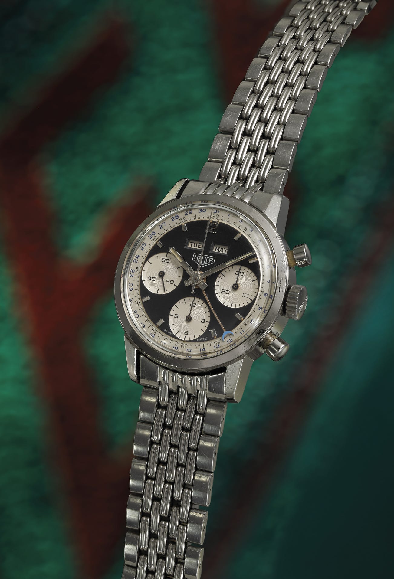 The present lot, part of the later models, displays a very attractive reverse panda dial with a blue calendar outer scale perfectly matching the blue crescent at the tip of the calendar hand. The small indexes are elegantly placed on the inner section of the dial to ease time reading without overloading the dial's aesthetic. On top of the 12-hour chronograph register, one can identify a T to confirm the use of Tritium on the luminous.
