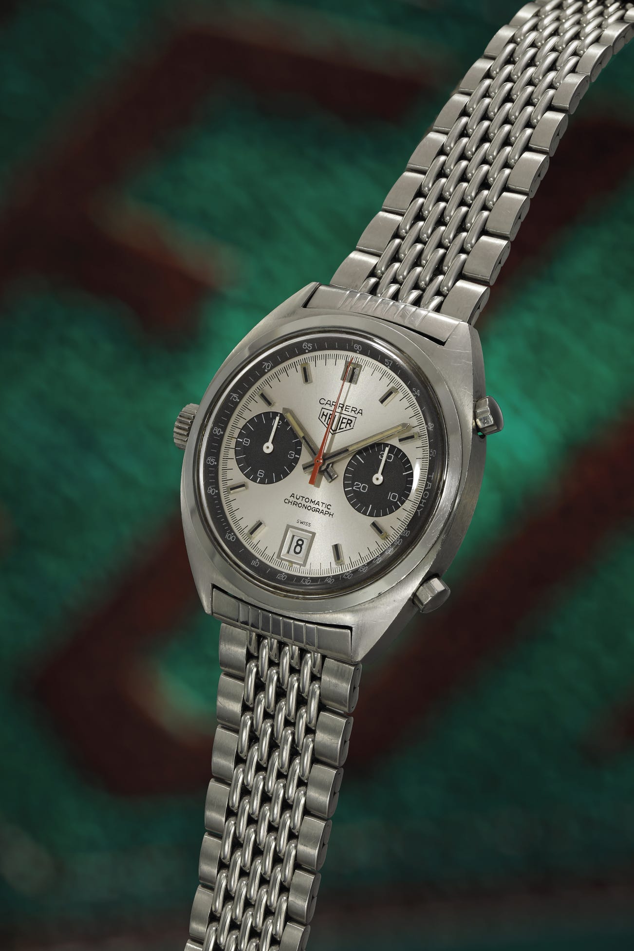 The Carrera reference 1153 was part of the trio of models Heuer used to launch the Calibre 11 automatic chronograph movement in 1969. The other two being the Autavia “Siffert” and the Monaco. The first examples of these three models had the model name above the date and the word Chronomatic above the Heuer badge. Only a handful of these were produced as Heuer rapidly sold the Chronomatic name to Breitling.