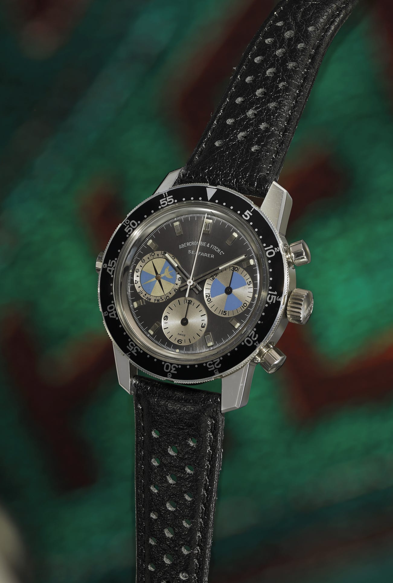 A very fine and extremely rare stainless steel chronograph wristwatch with black dial, tidal indication and hours/minutes bezel retailed by Abercrombie & Fitch.
