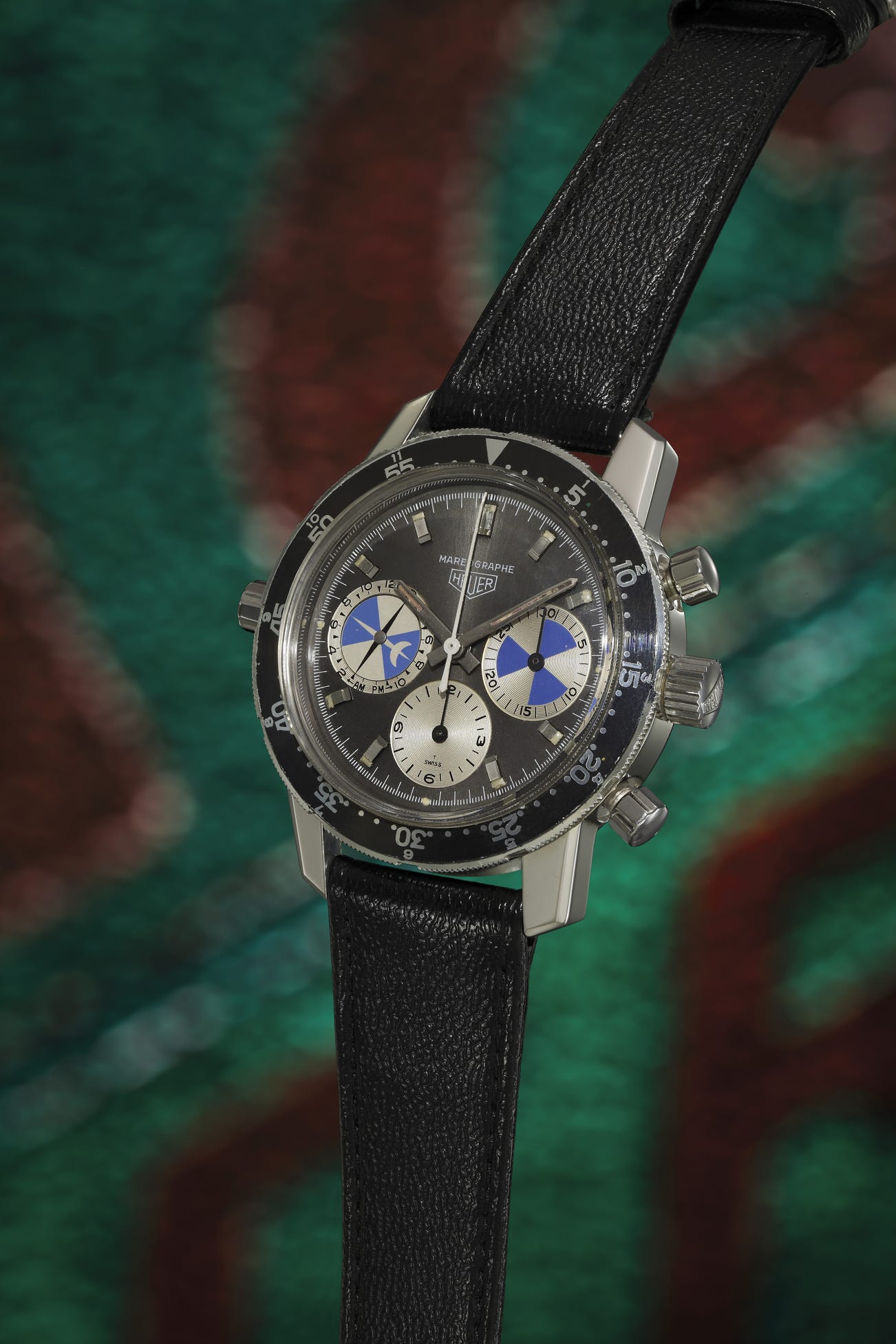 The present watch also distinguishes itself by the signature found on the dial. When most of the Seafarer or Solunograph models were retailed by Abercrombie & Fitch or Orvis, a very small portion of the production was kept by Heuer and sold under its own name. So rare were the latter that less than 15 other examples have surfaced until now.