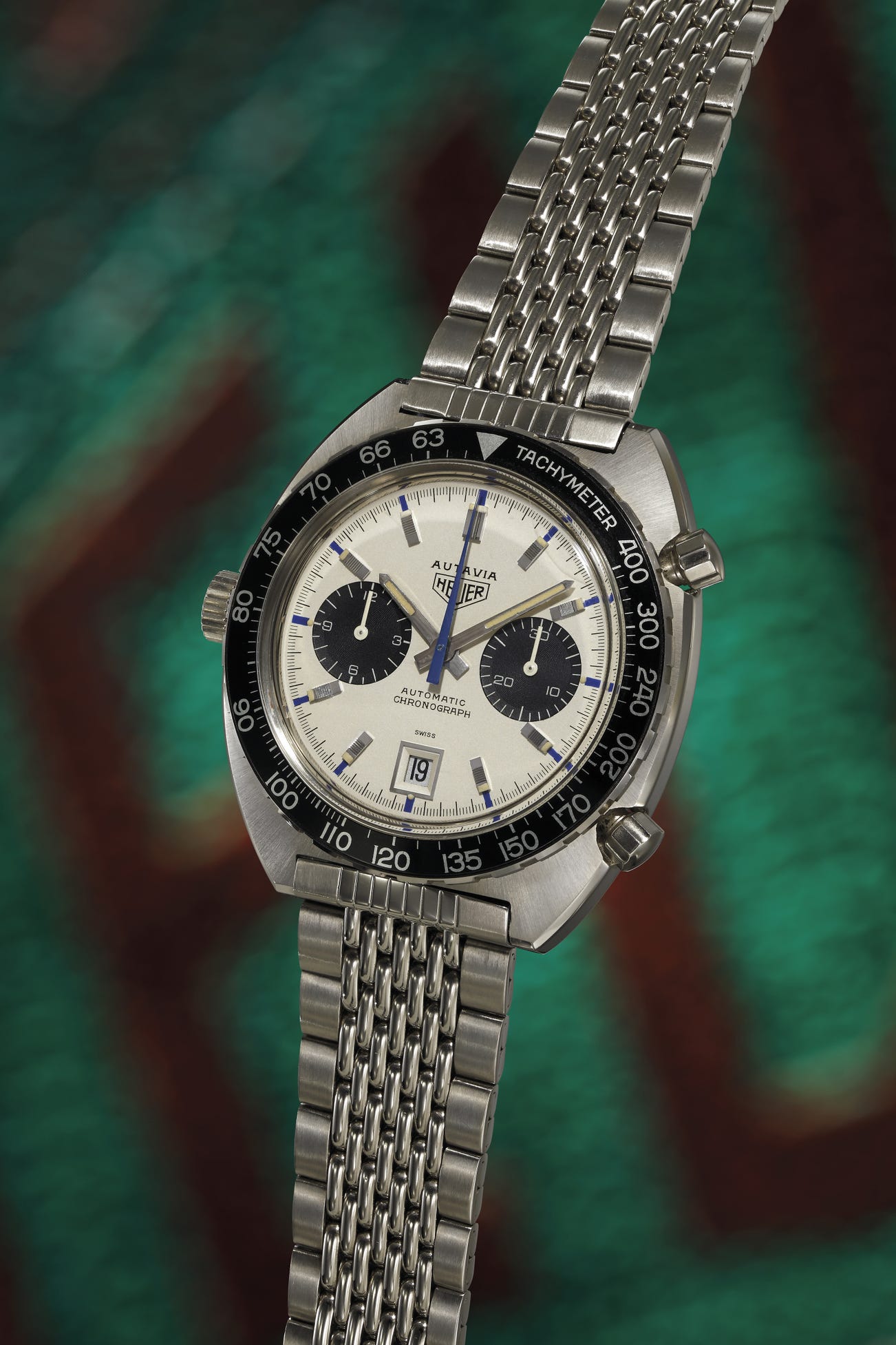 The Autavia was the timepiece of choice for many famous Grand Prix drivers of the 1960s and 70s. Amongst them was Jo Siffert, the Swiss double Formula 1 Grand Prix champion who used to wear an Autavia 1163 with tachymeter scale, white dial with black registers, date and blue seconds chronograph hand and markers, explaining this lot’s nickname.