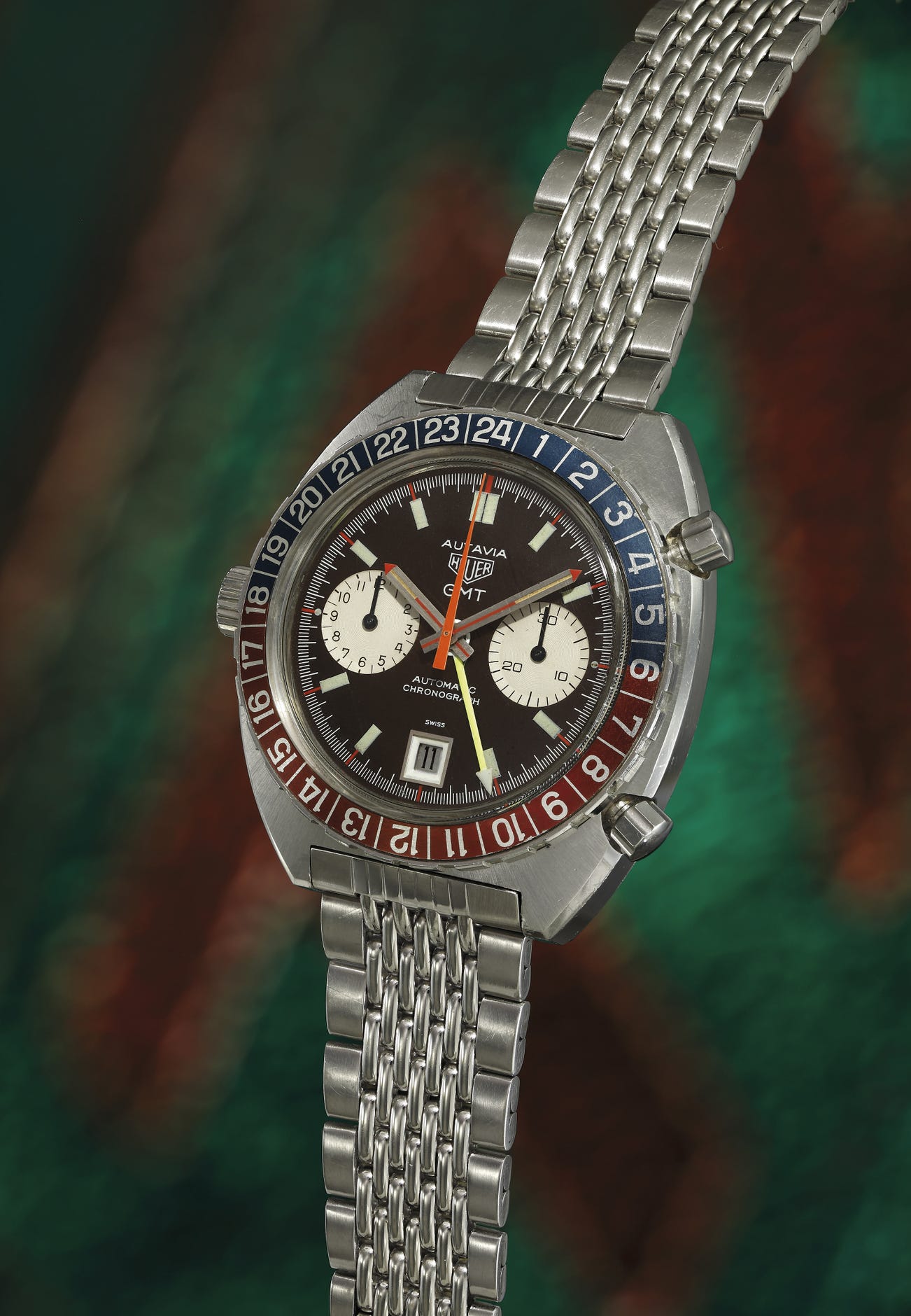 The first Autavia reference 1163GMT housed the calibre 11 modified for the 24 hour GMT indication. Very early examples have the 1 to 24 rotating bezel and brushed steel hands with red insert such as on this present example. The first execution quickly morphed into the second and third execution GMT variants, but it is the first that remains the rarest of the automatic reference 1163 GMTs.