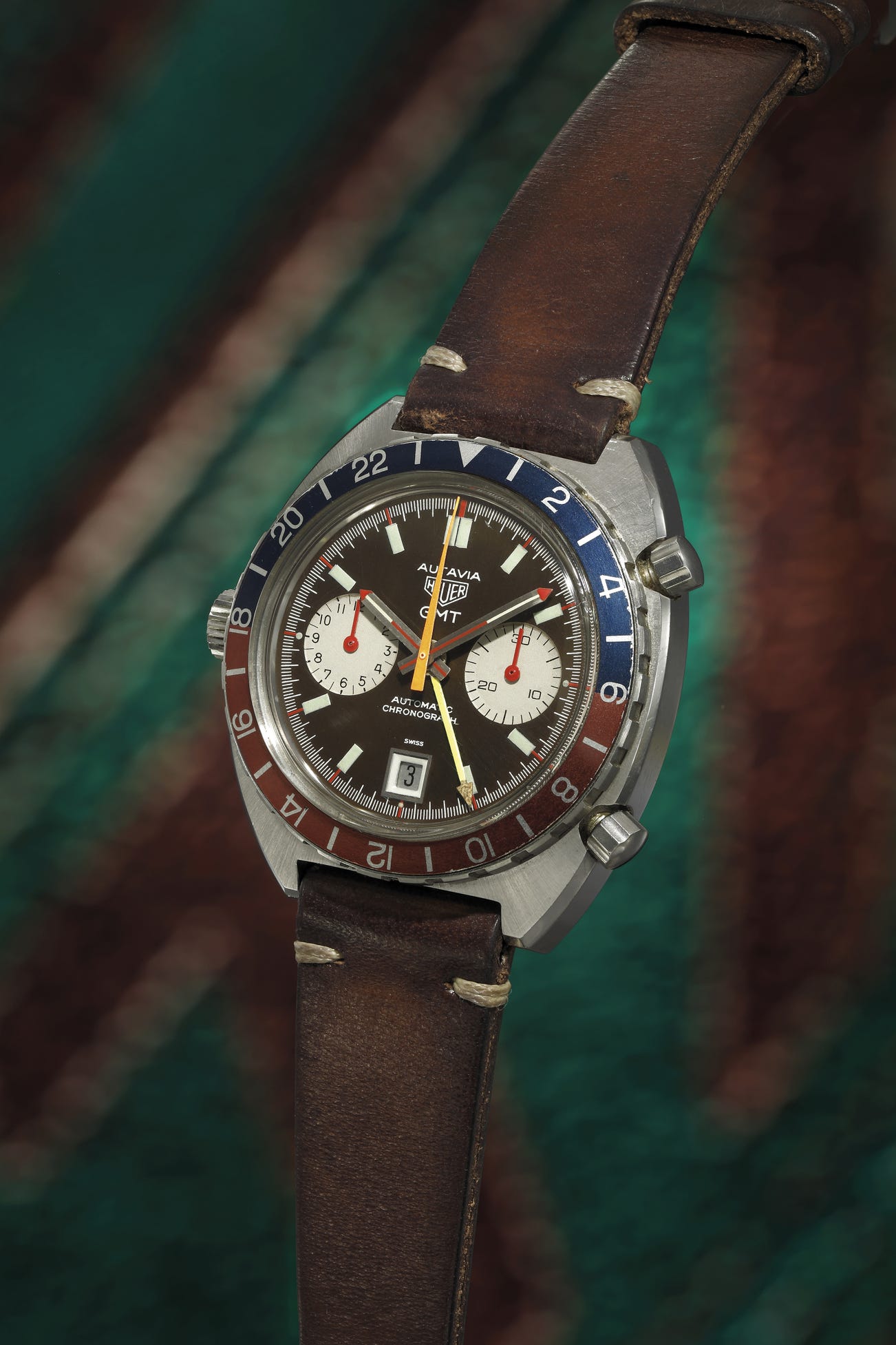 Following the launch and subsequent success of the Autavia Ref 1163 in 1969, Jack Heuer followed up with the 1163GMT reference. The first modification was to the calibre 11 movement for the 24 hour GMT module. Upgrades quickly followed to a purpose built GMT movement, the calibre 14 which was launched around 1972. Early examples have the 1 to 24 rotating bezel and brushed steel hands with red insert. The second ones from 1970, like the present lot, used the even number only bezel and red hour and minute hands. This is a short-lived feature as allegedly pilots found red hands difficult to read in low level light conditions consequently most examples thereafter used black sub-dial hands.
