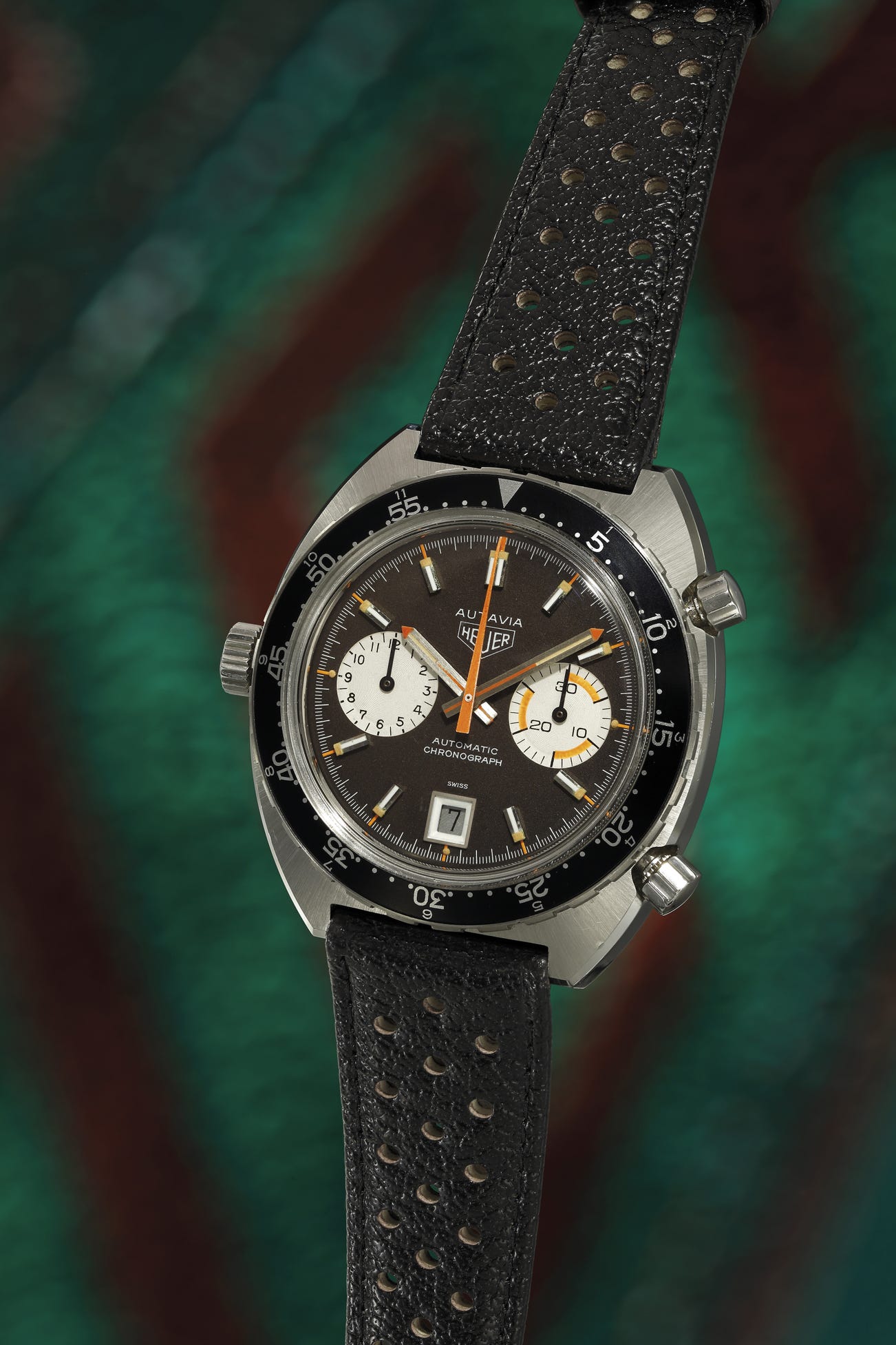 Introduced in 1971, the present reference stands out by the orange accents on the dial and on the hands, leading horology collectors to nickname the watch "Orange Boy". The production of this watch model ranged from serial numbers 241'xxx- to 244'xxx, placing the present timepiece into the very early production stage. This model was only available with two variations: the earliest production models like the present example display Monaco style hands, while the later production models had orange strips on the edge of the hands.