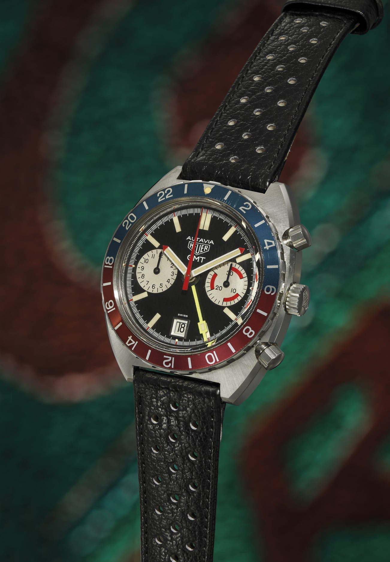 Launched in the mid-70s, at a time when demand was strong for automatic or quartz movements, this Autavia GMT model powered by the manual wind caliber Valjoux 7741 mechanism needed to find means to stand out in the watch market. Conscious about the challenges this manual watch had to face, the brand decided to pay special attention to the design of its dial, gifting this timepiece with a powerful bright yellow second time zone hand beautifully contrasting with the red accents on the hands and 30 minutes counter. Unfortunately, despite this attention to detail, this model did not encounter the success it deserved and sales were below the brand's expectations.