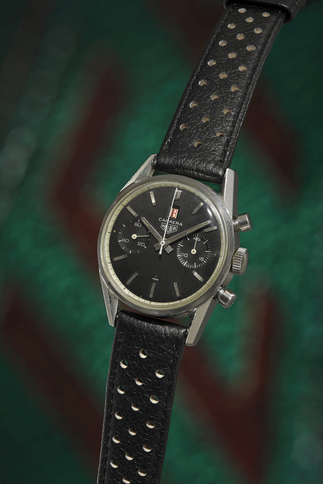 This example features another subtle specification. While most of the dial inscriptions were printed in white this one features silver script, perfectly matching the stainless steel case. Produced for only a short period of time, the present lot will appeal to the chronograph enthusiast in general and the Heuer aficionado in particular due to its particularly fierce look with bold bevelled lugs, its stealthy, all black dial highlighted by the white chapter ring and the striking contrast of the red date disc.