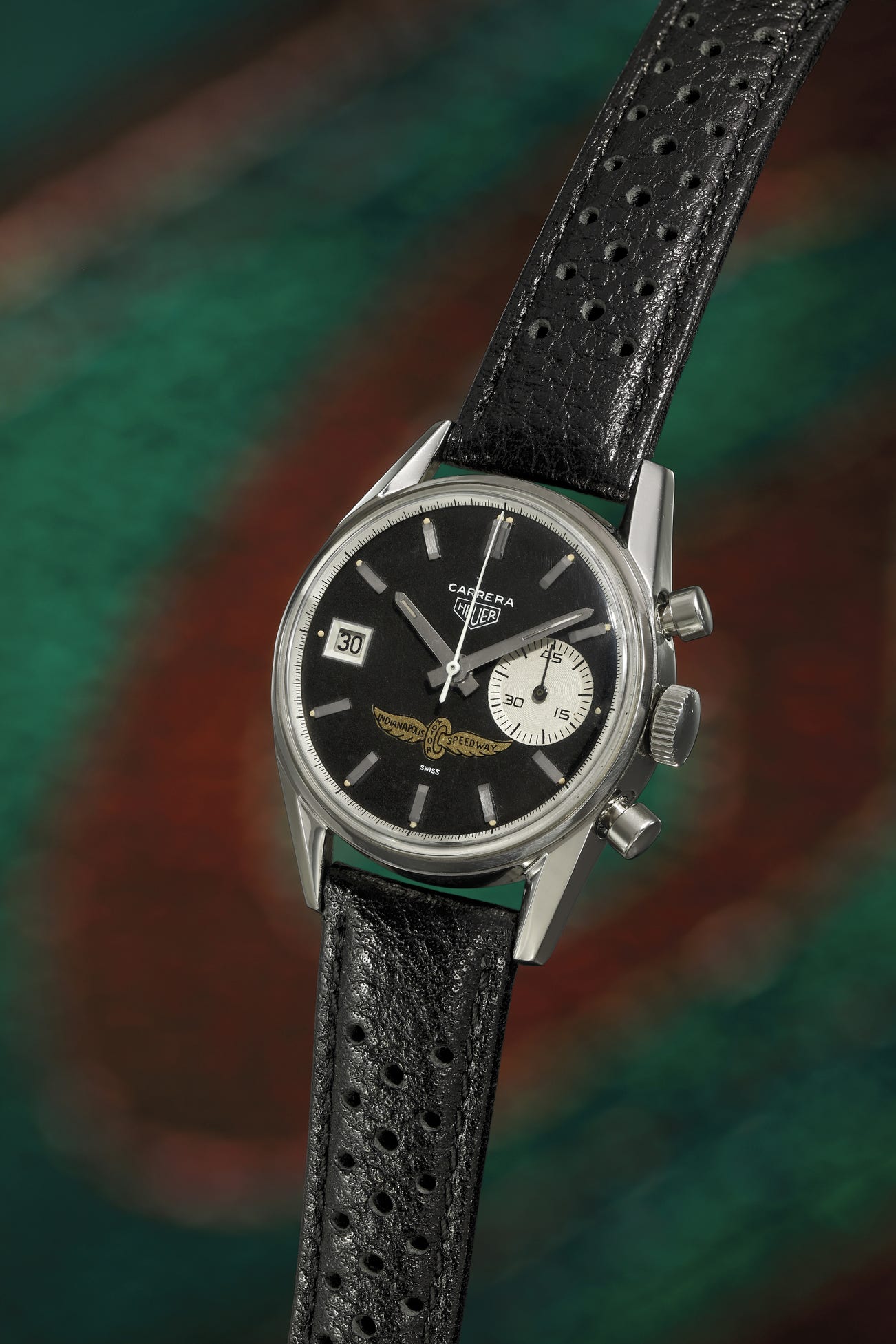 Heuer yet again saw a lucrative opportunity with this notorious race and in 1969 released a few hundred promotional watches for the pilots and sponsors of this adrenaline infused race. Many were sold in the gift shop next to the racing circuit. The first version of the Carrera reference 3147 timepiece had a date aperture located at 12 o’clock and was only produced for one year. The second version shows a different date position at 9 o’clock as illustrated with this watch.