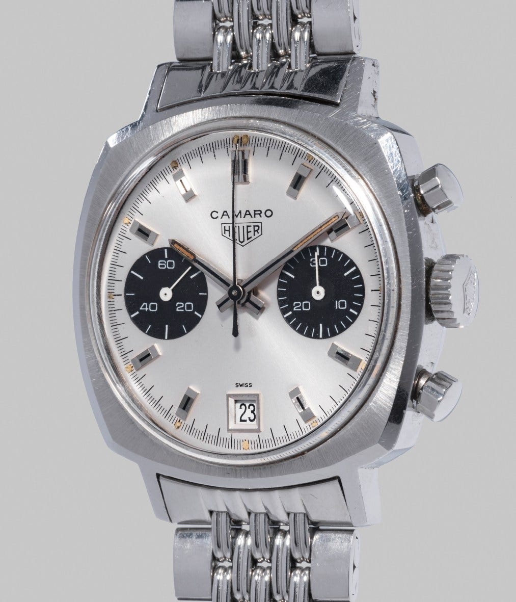 In the late 60s, Jack Heuer launched a new model to strengthen the brand’s position in the U.S. Called the Camaro, it was larger than the Carrera and fitted in a cushion-shaped case, offering a more robust style than its predecessor to fit the US market requirements. To further appeal to the targeted market, the watch was named after the famous pace car used in the Indianapolis 500 race during the years 1967 and 1969: the Chevrolet Camaro.