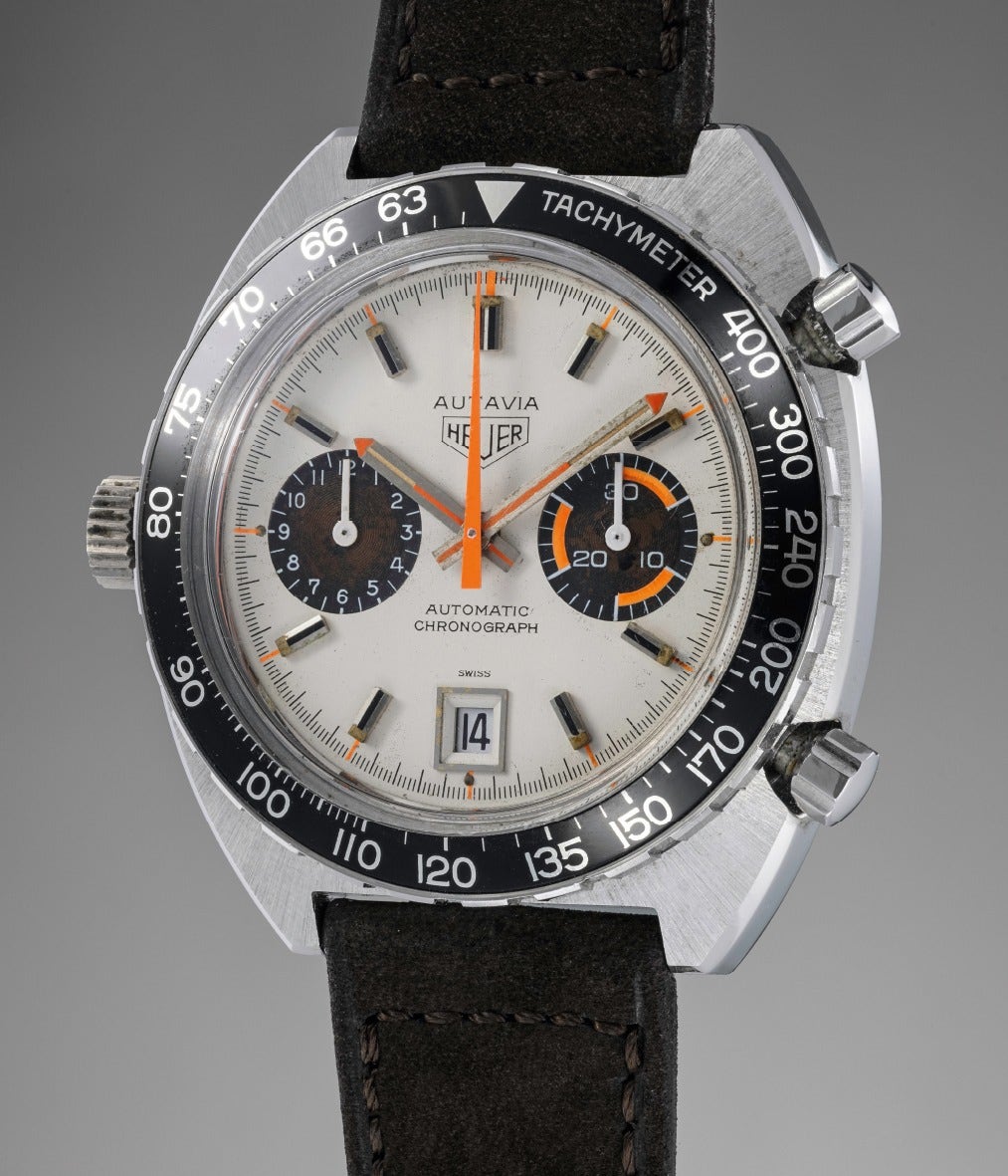 Heuer launched in 1969 its first automatic chronograph movement, the caliber 11. Housed in their three iconic chronograph models at the time which were the Carrera, the Autavia and the Monaco, this movement was soon replaced by the more robust and more accurate caliber 12, featuring a gilt plate instead of a nickel plate. The present watch is powered by this gilt caliber but what makes it even more remarkable is to be found on the dial. The early 70s saw the use of bright colors in design and day to day objects. The watch industry also took up on this trend and Heuer offered some watches with orange accents on the dial. The best known is the “Orange Boy” with a reverse panda dial with orange accents. The present watch, nicknamed "White Orange Boy" is actually its exact opposite, featuring a white dial with black registers, that have beautifully aged to a warm and lively brown patina while the orange accents have remained very bright. This version is much rarer, as scholars have not witnessed more than 10 examples to have surfaced so far.