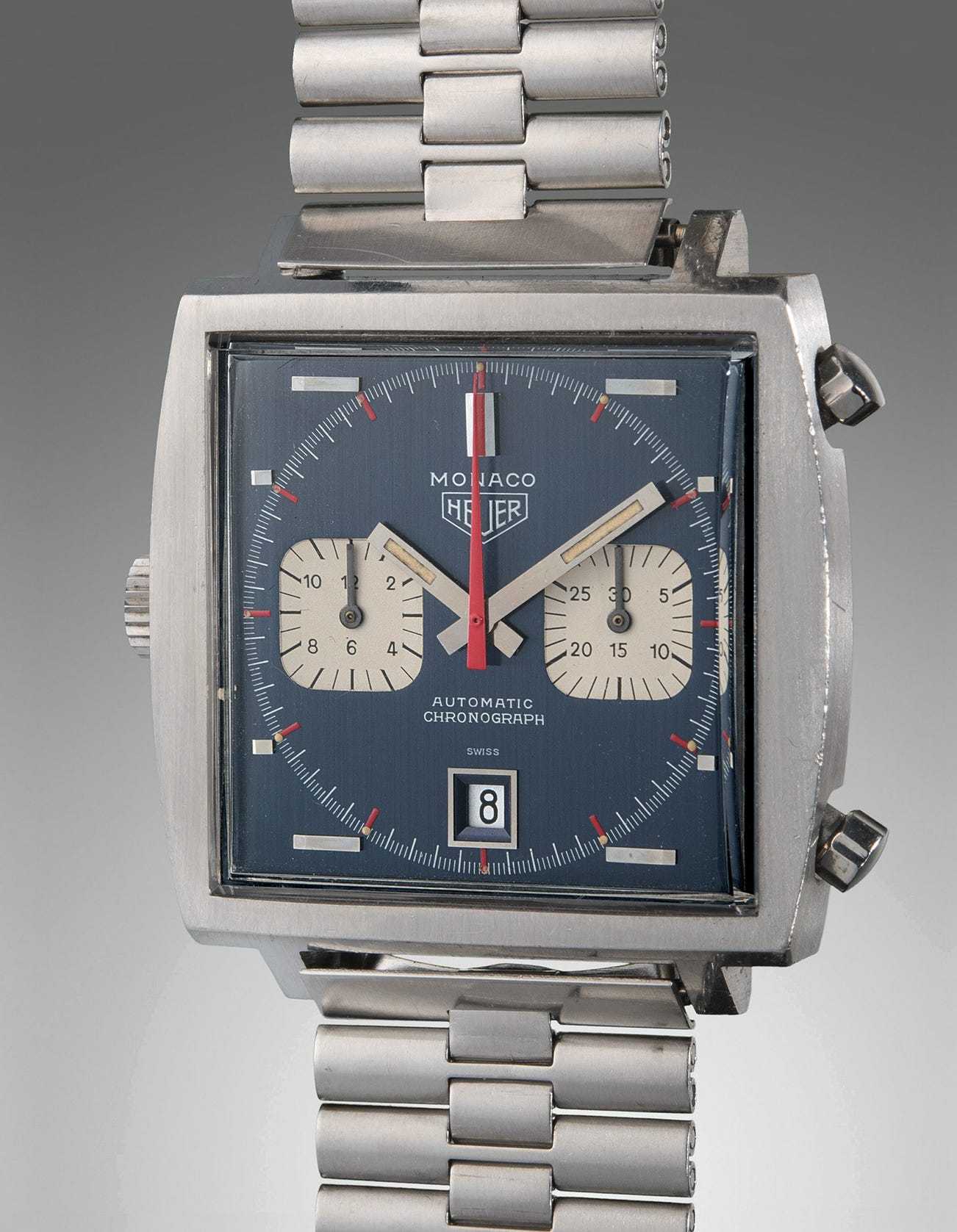 Launched in 1969, the Heuer Monaco was one of the first automatic chronograph wristwatches available in the market. Along with the self-winding Zenith El Primero, these chronograph watches were at the forefront of innovative design and technology of the 1960s and 1970s. The oversized square-shaped case, manufactured by Ervin Piquerez SA (EPSA), with left-handed winding and setting crown were unique features designed by Jack Heuer, and while a completely new concept at the time, today this model has become an icon known for its contemporary look and feel. The watch gained notoriety when Steve McQueen wore an example in the classic racing film “Le Mans”.