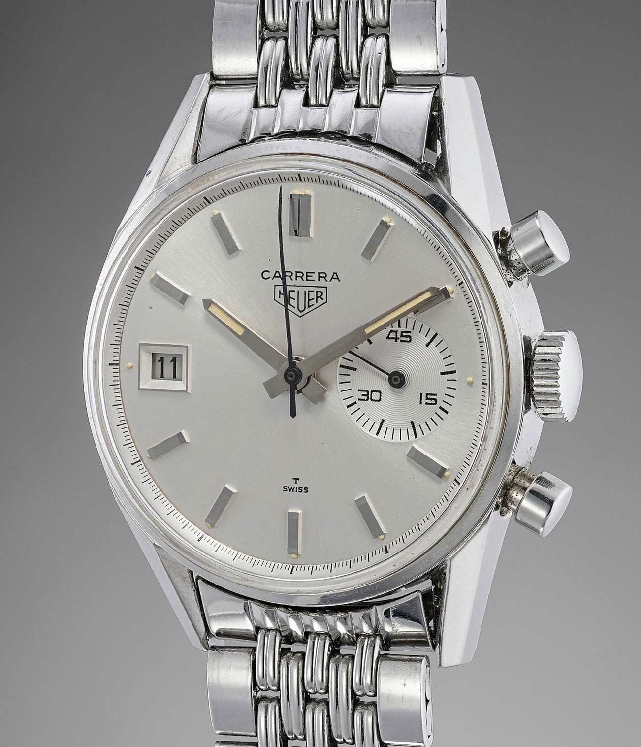 Reference 3147 appeared in 1966 and was powered by a Landeron 189 caliber. The first execution had the date positioned at 12 o’clock which made it hard to read when the chronograph hand was not in motion. The second version, like the present model, was modified to accommodate the date at the 9 o’clock position, thus replacing the running seconds feature.