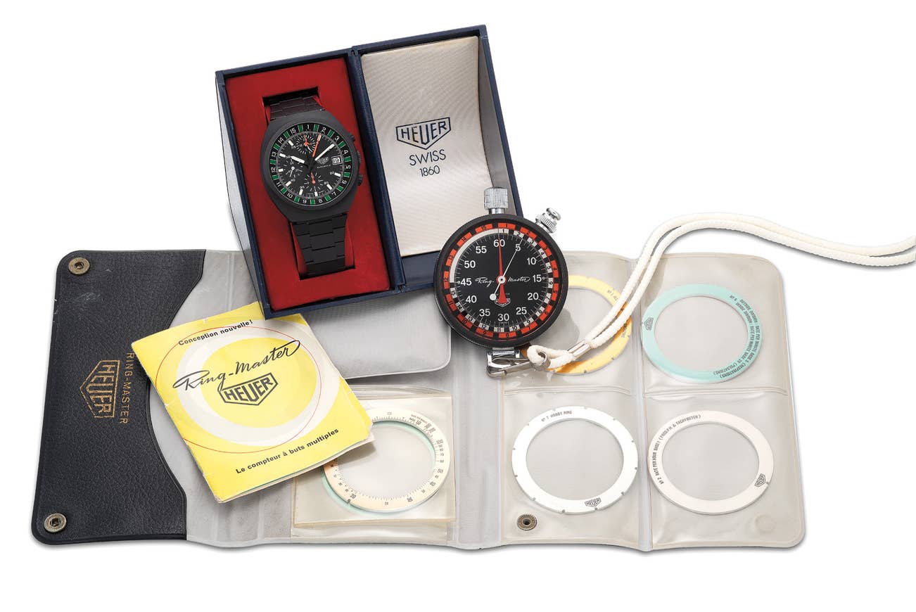 Accompanied by Heuer presentation box, leather Ring Master envelop with seven interchangeable rings for the Ring-Master chronograph, instruction booklet in French and neck strap