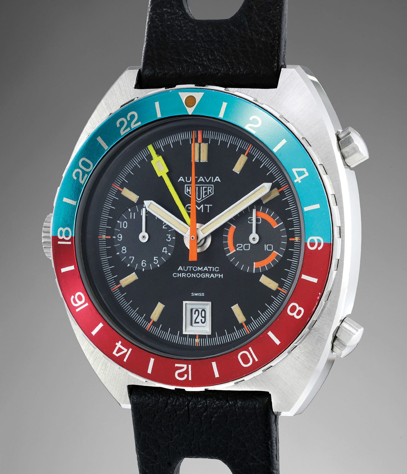The first Autavia reference 1163GMT housed the calibre 11 modified for the 24 hour GMT indication. Later examples like the present 3rd execution are fitted with a caliber 14. The design of the dial and hands also evolved with this late execution. From 1970, the neon GMT hand’s tip was replaced by a square and the 30-minute counter was divided in 6 segments of 5 minutes each. Most often seen with a black dial and white subregisters, red accents and red edged hands, this reference was available in two dial variations. The present watch, features the rarest version with dark grey subregisters and black dial allowing the bright hands and neon orange accents on the 30-minute counter to offer a striking contrast.
