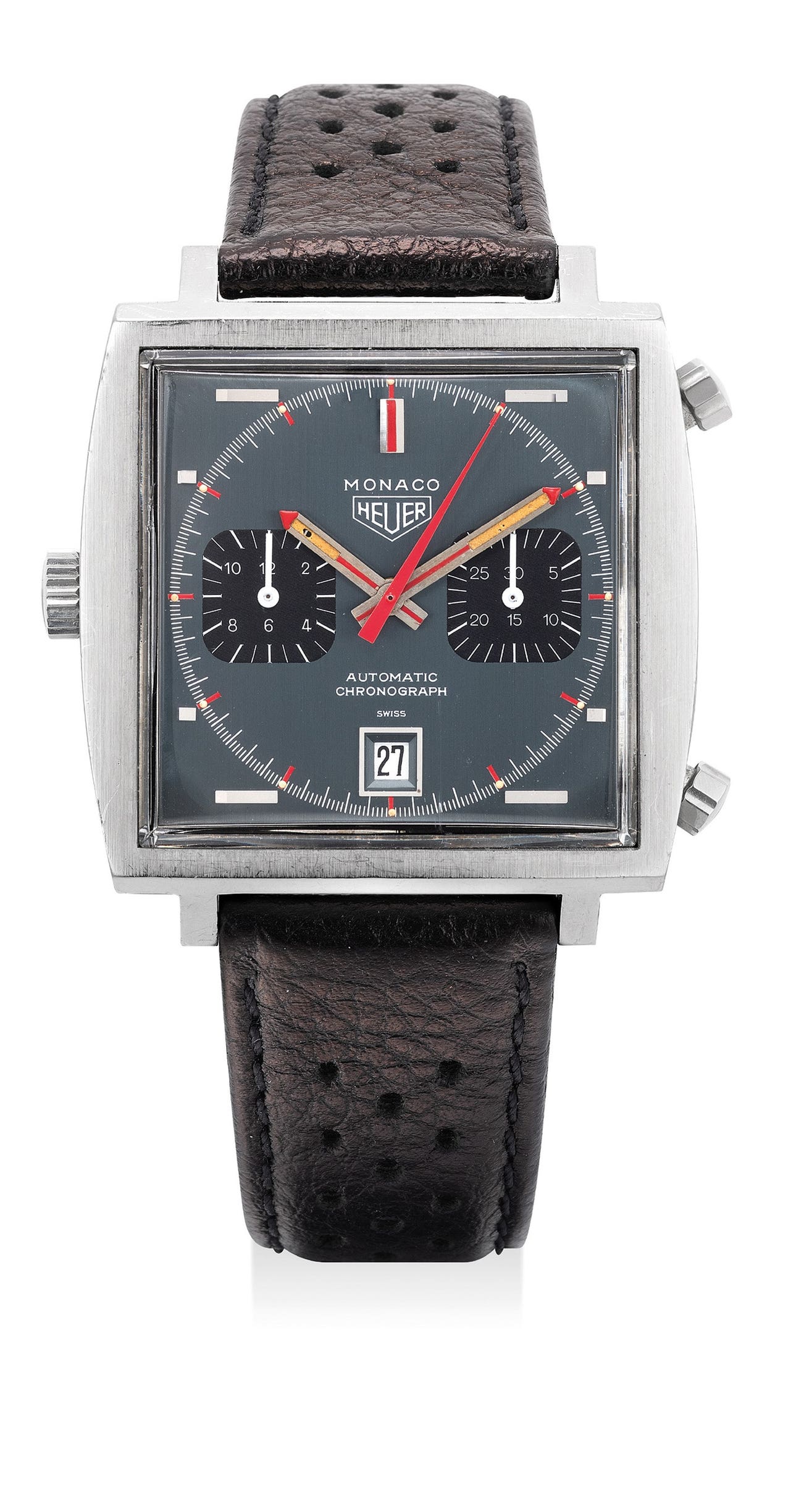 The present example is a high quality specimen of a 1971 automatic Heuer Monaco with an enthralling asphalt grey dial harmoniously matched with cherry red hands. Further accompanied by its original guarantee and presentation box, this is a great opportunity for passionate lovers of racing to acquire an iconic part of the history of racing.
