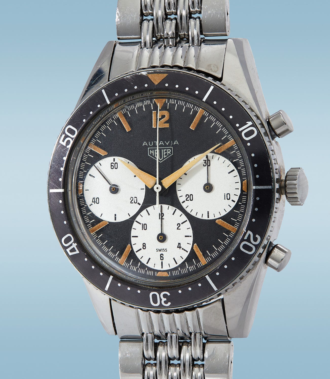 In 1961, Jack Heuer and his production team decided to create the Autavia with the name coming from a combination of the words “Automobile” and “Aviation” as their first named chronograph. Prior to then, Heuer hadn’t designed a chronograph wristwatch with a rotating bezel, and the Autavia would have this new feature with a choice of calibrations. Two bezel types were offered, one with 60 separate one-minute divisions that allowed the wearer to set a marker for a defined interval of time, while the second bezel had 12-hour divisions that would allow for another time zone to be displayed. An early Heuer brochure from 1962 illustrated both the reference 2446 and the reference 3646 under the title "New AUTAVIA Chronographs for pilots, sportsmen, divers and scientists”. Clearly, Heuer aimed to market this new collection across a broad spectrum of active professionals.