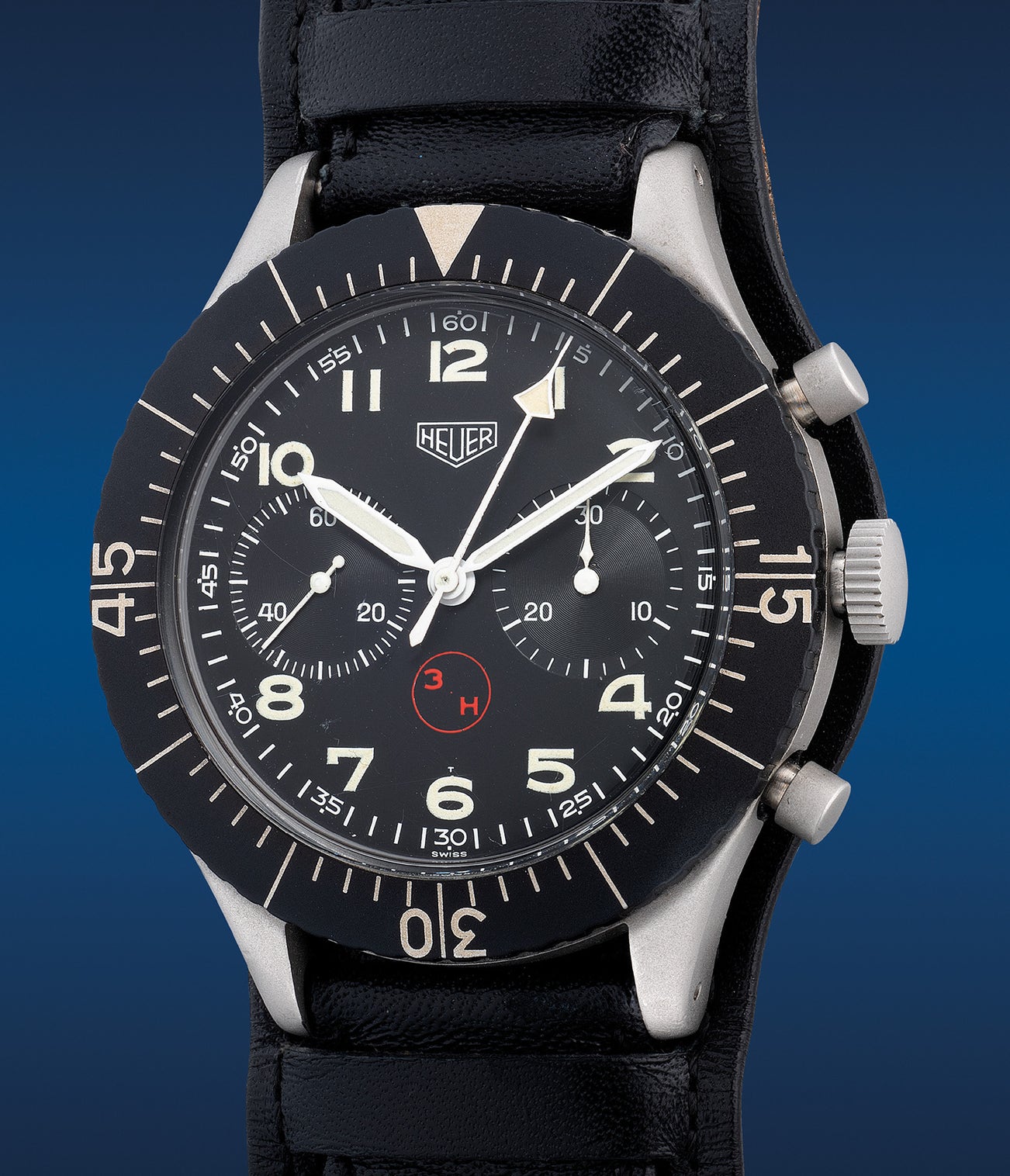Since the inception of the Bundeswehr in 1955 until circa 1990s, the formation of the armed force was known as one of the most well-organized and equipped armies of its time in Germany. Heuer with a long history of delivering entrusted military tool watches to the air forces, the ref. 1550SG flyback chronograph with an impressive build and practicality became one of the best companion for pilots at the time. The Bundeswehr chronograph sports in an attractive gun metal shade stainless steel can be found with various dial variations. Equipped with a black dial with large luminous Arabic numerals and hands, Heuer acknowledged the presence of radioactive material through the use of an encircled red "3H" and a small white “T” at 6 o'clock - this is because hydrogen-3 is the chemical compound for radioactive luminous material. Preserved in superb condition with a caseback seen clearly engraved with “BUND 6645-12-146-3774”, the present ref. 1550SG is further charmed with a rarely seen bund strap issued by the German military with Bundeswehr numbers. Ticking the boxes with all desirable traits, the present Heuer Ref. 1550SG certainly deserves the attention of military watch enthusiasts.