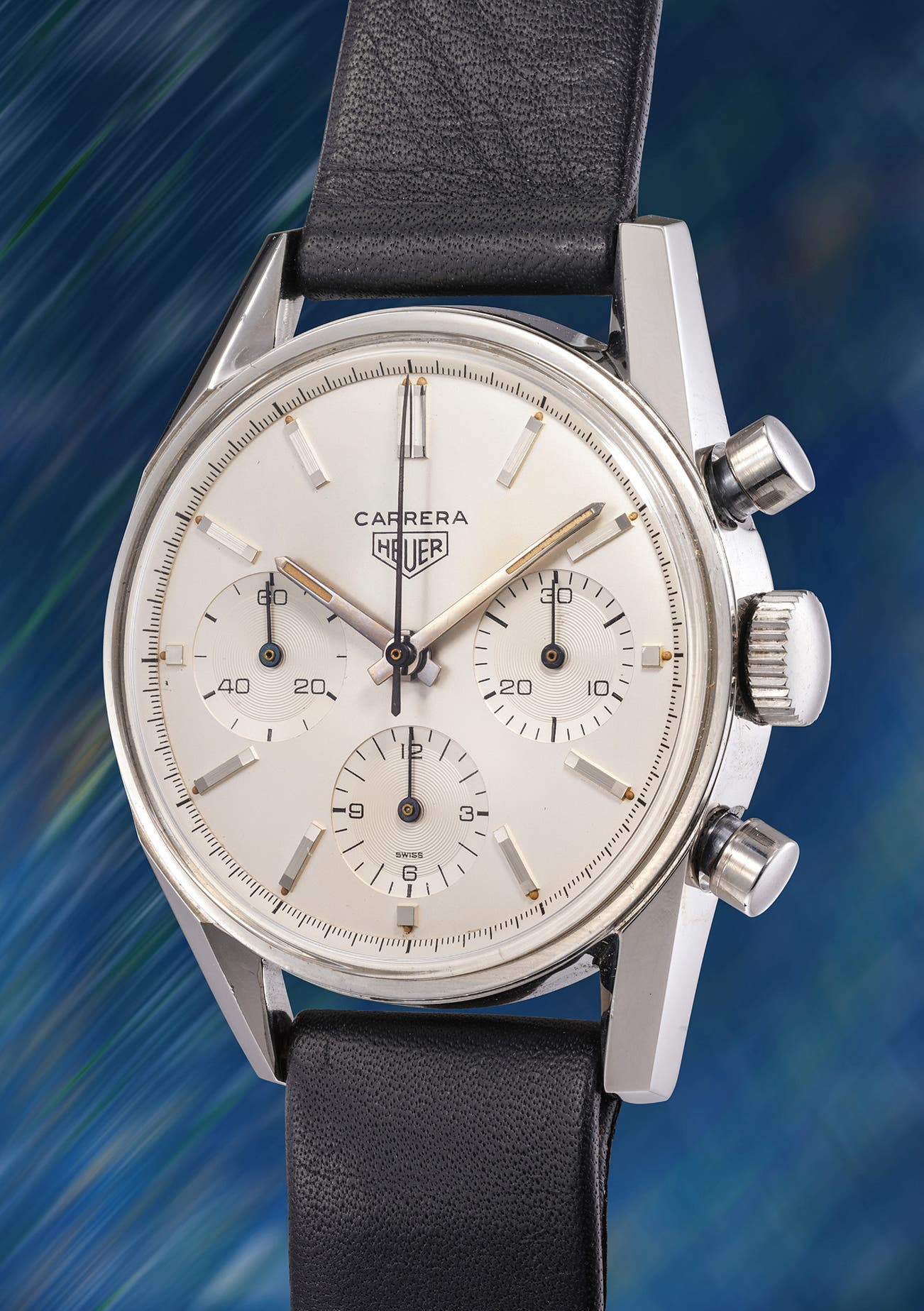 This early example, in excellent condition, features elongated applied markers, a dial signed “SWISS” inside the 6 o’clock register, and the “Ed. Heuer” signature on movement and caseback—details found only before the 1964 Heuer-Leonidas merger.