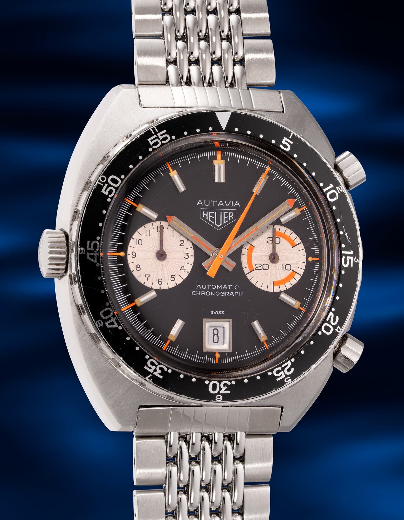 - The present watch, nicknamed "Orange Boy" features a black dial with white registers and bright orange luminous accents. With its iconic C-shaped case and winding crown on the left, this example features the MH bezel (Minutes and Hours) as well as a desirable Gay Frères bracelet that gives this chronograph the extra allure that brings you back to the glorious days of the 70s. Furthermore, it is accompanied with the Heuer box, guarantee and hang tag. With vintage Heuers slipping under the radar in recent years, this is a fantastic opportunity to acquire the cools of 70s.