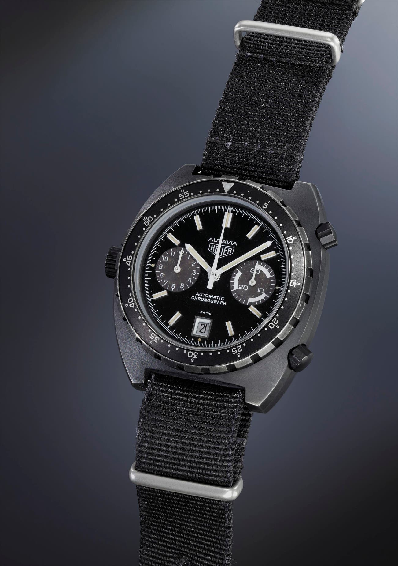 For an issued watch intended for military use, the present example was sparingly worn on the battlefield, if ever. The black PVD is completely present throughout the case, in accordance with the watch’s overall excellent, original condition. The present lot is an outstanding, rarely seen example of a military-issued Heuer watch for the discerning collector.