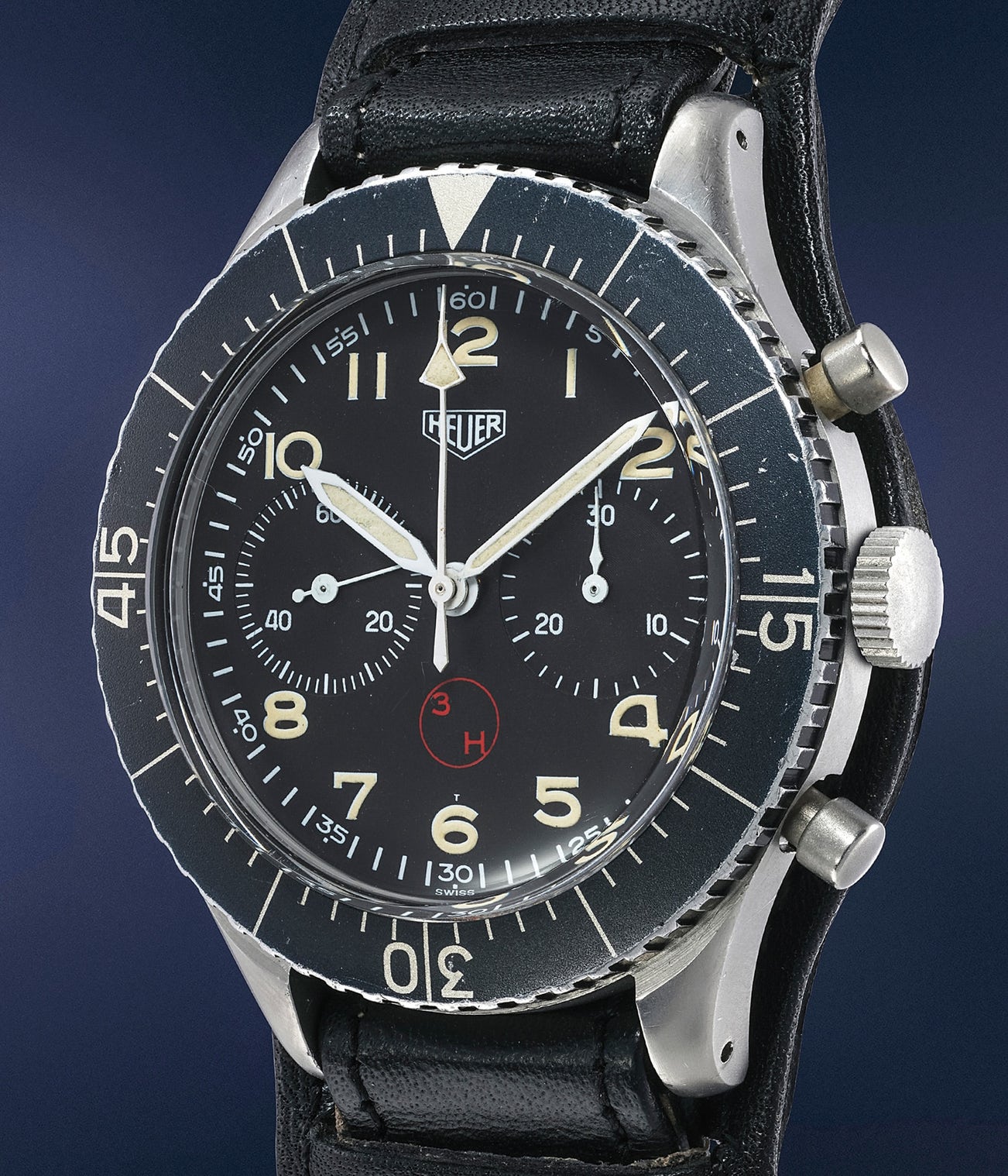 This watch was created to be an army pilot’s true companion. The design, dial and case allow for practical visibility, comfort and reliability even throughout the most strenuous of missions. Whilst other watch manufactures opted for an encircled letter "T" for tritium on their dials, Heuer acknowledged the presence of radioactive material through the use of an encircled "3H" at 6 o'clock - this is because hydrogen-3 is the chemical compound for radioactive luminous material. This Heuer 1550 SG, in great overall condition, presents all the characteristics of a military watch with its black dial, large luminous Arabic numerals and lume on the hands which have all aged gracefully. This watch possesses both the flyback chronograph as well as a hacking function.