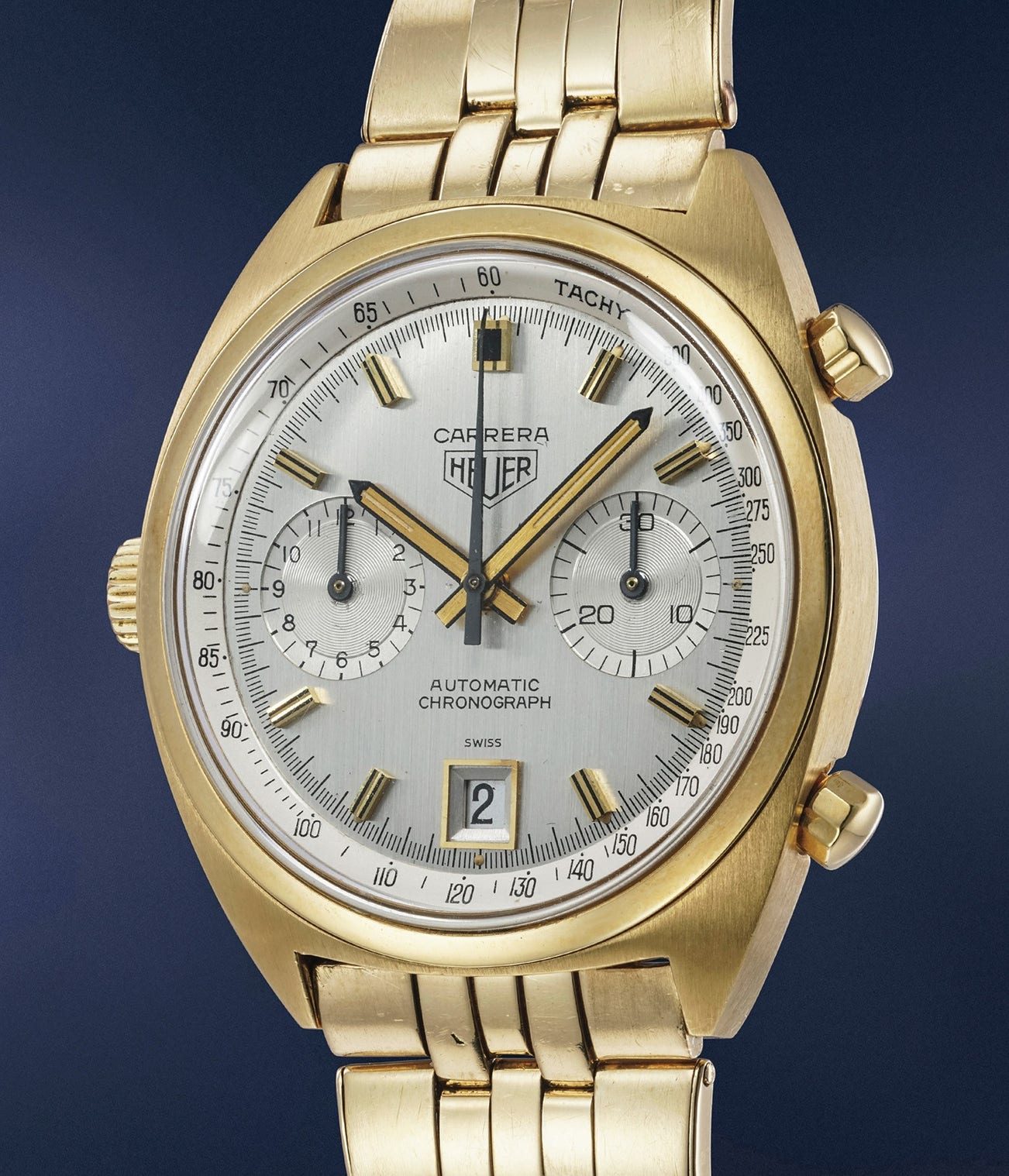 To go with the new automatic caliber, the Carrera's design was slightly altered, the crown moving to the left side of the case in order to differentiate it from the self-winding version.