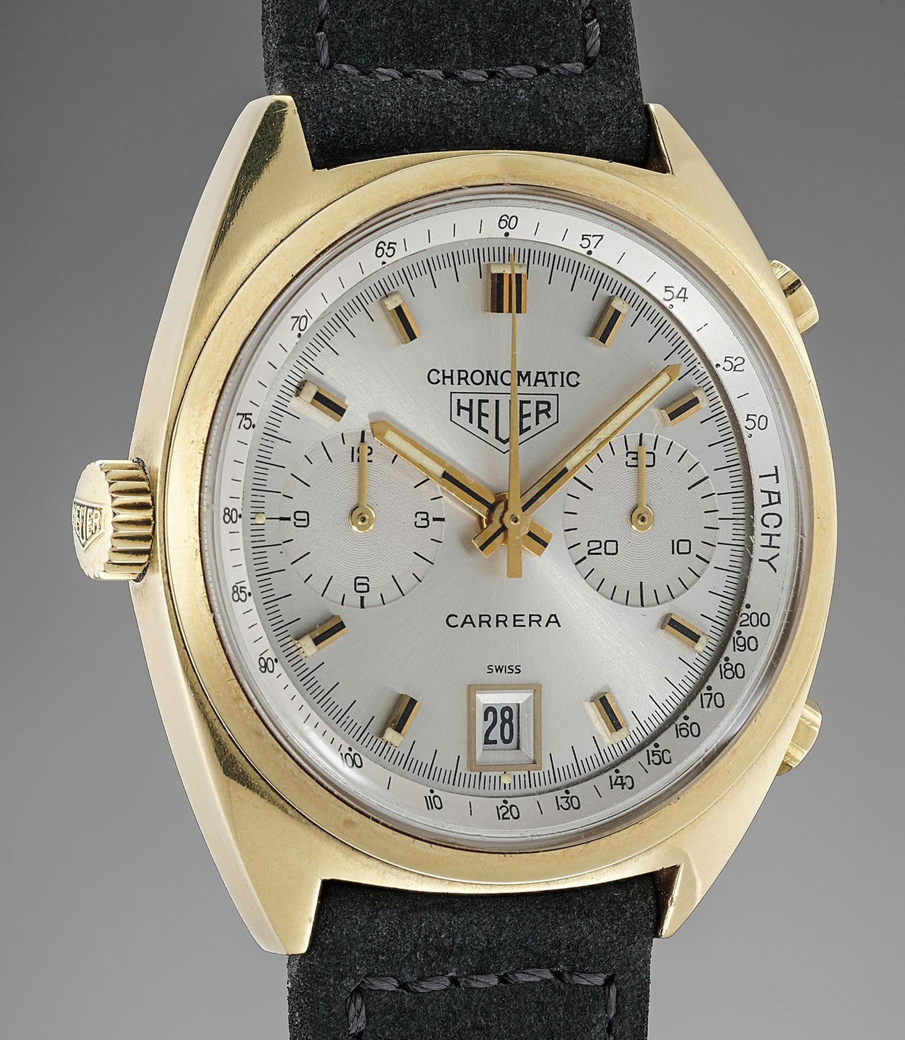 The present very early automatic Carrera Chronomatic was the first to present Heuer’s new automatic caliber. The word Chronomatic would later disappear from Carerra’s language, to be used solely by Breitling.