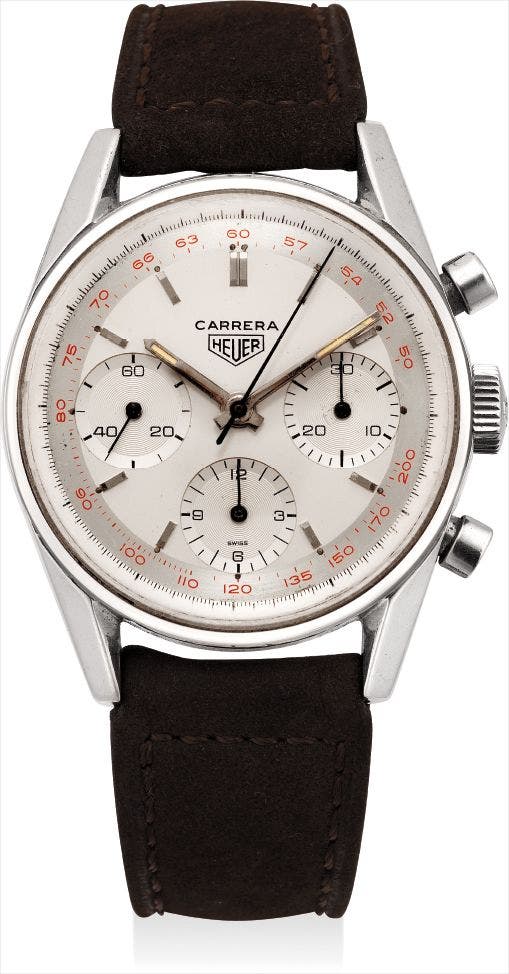 Heuer has always been associated with motorsports and precision timing, and the legendary Carrera is perhaps the archetypal motorsport Heuer. The present watch, a reference 2447T, is notable for being an early example, lacking the "T" on the hour register at six o'clock. Most attractive is the two-tone dial with a silvered tachymetric scale featuring large red numerals, another feature found only on earlier models.