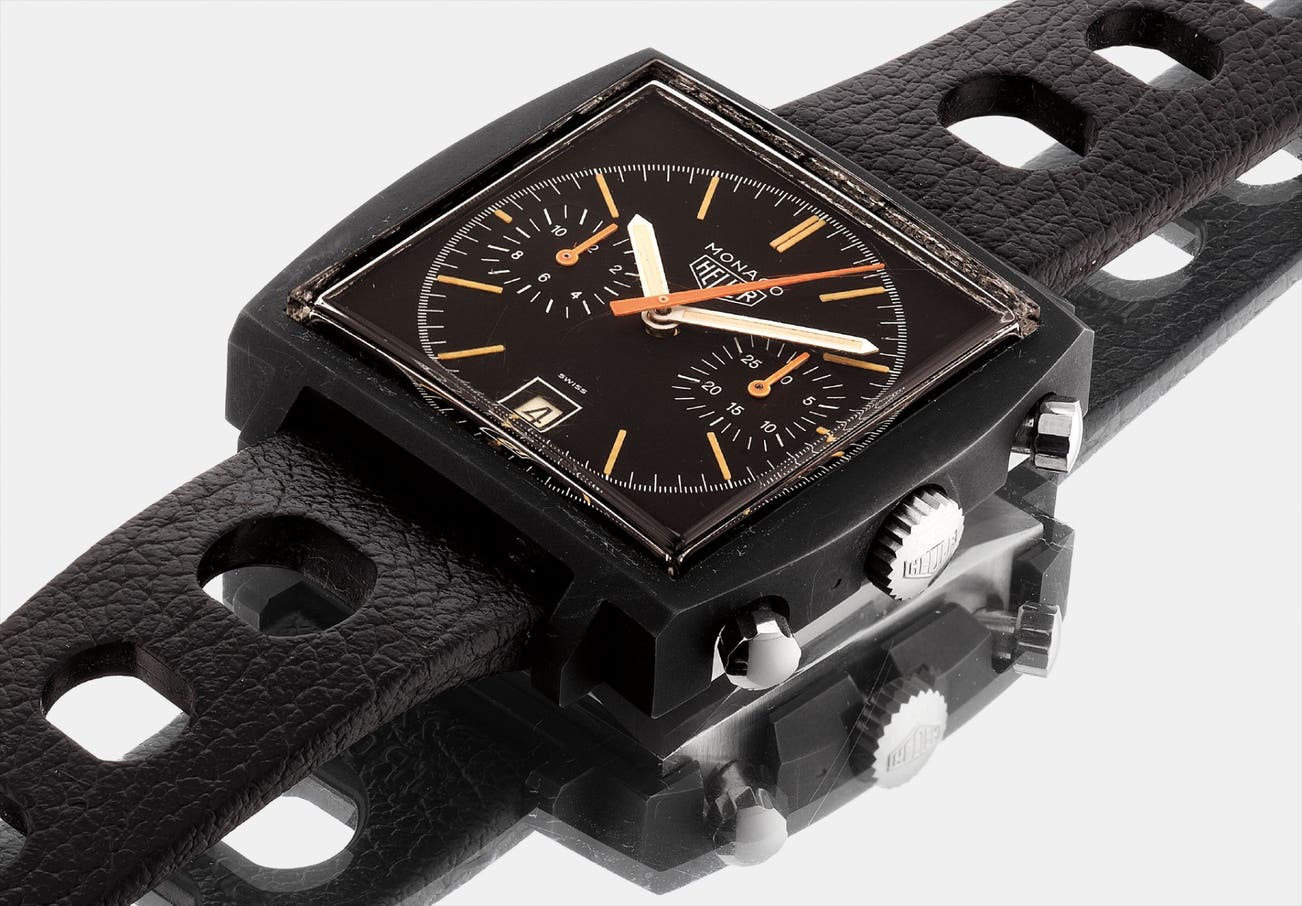 Heuer’s Monaco ‘Dark Lord’ is one of the rarest chronographs available on the market today. Produced only in 1974, their numbers are limited, and rarely come to auction. The Monaco was the first square-shaped chronograph produced, however with lackluster sales, Jack Heuer sought to make a design change, which might attract a larger buying public. After seeing Juan Carlos of Spain wearing a black watch, Heuer sought to put a PVD coating on the Monaco.