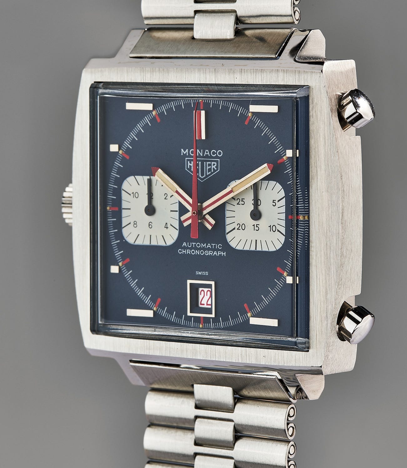 In 1969, one of the most avant-garde chronograph wristwatches was released by Jack Heuer, and today it is an icon amongst watch aficionados, known for its automatic movement and modern square-shaped case. The Heuer Monaco reference 1133 took its name from the legendary Formula One racetrack and was brought to international fame when the Monaco timepiece appeared on the wrist of the American actor Steve McQueen in his classic auto racing film, Le Mans, released in 1971. The chronograph design created a new aesthetic, with its large oversized square-shaped case, blue dial, white subsidiary dials and red-accented hands and hour markers.