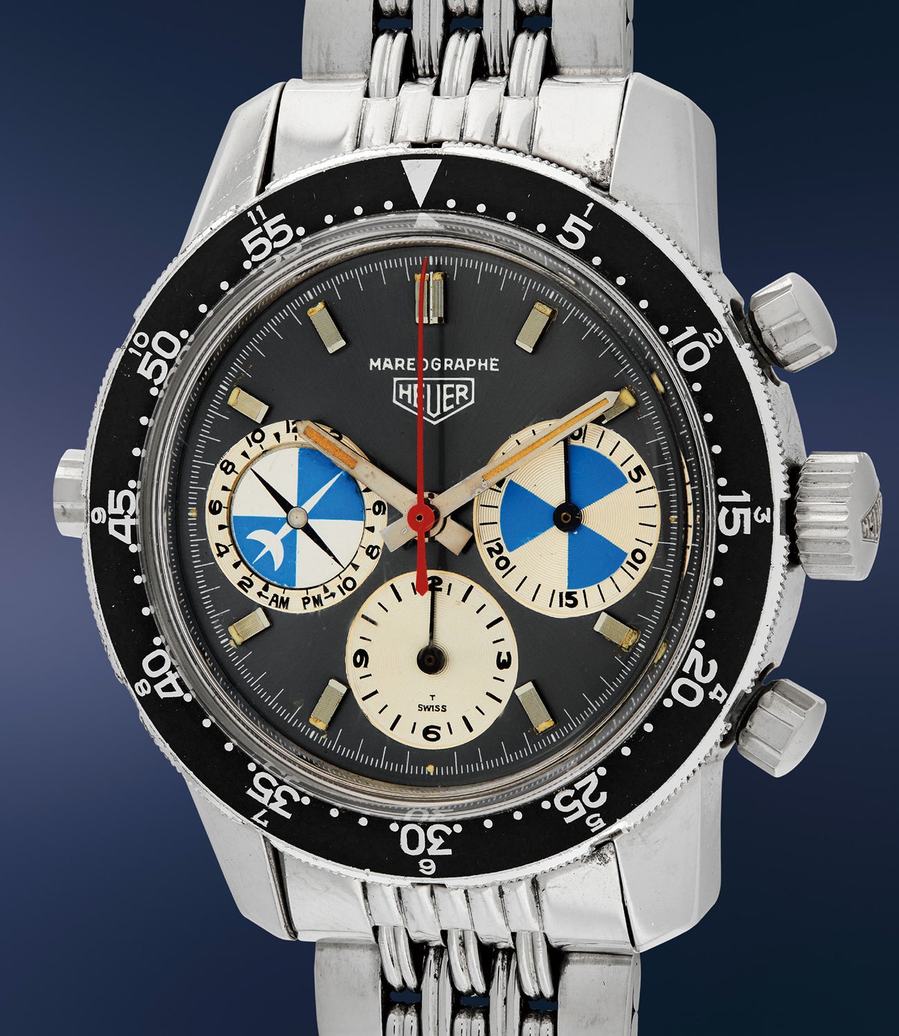 A rare and attractive stainless steel chronograph wristwatch with grey dial, blue tidal indication, and hours/minutes bezel with Gay Frères bracelet