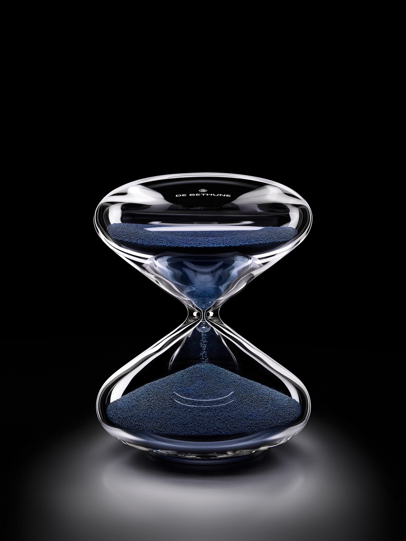 De Bethune presents this unique version of the Hourglass designed by Marc Newson, with a 30-minute duration size, hinting at an eternal conundrum: is the hour half full or half empty? The passage of time is made visible by nanoballs developed by master watchmaker Denis Flageollet cast in a rich, blue hue achieved from the precise and complex process of flame-bluing engineered by Swiss watch Manufacture De Bethune. This nuanced shade recalls the signature blue of French-artist Yves Klein, an artist who often incorporated fire and burning into his groundbreaking work. Contained within an elegant, sensuous glass container manufactured by HG Timepiece, these nanoballs incarnate time’s passing with distinction and flair.