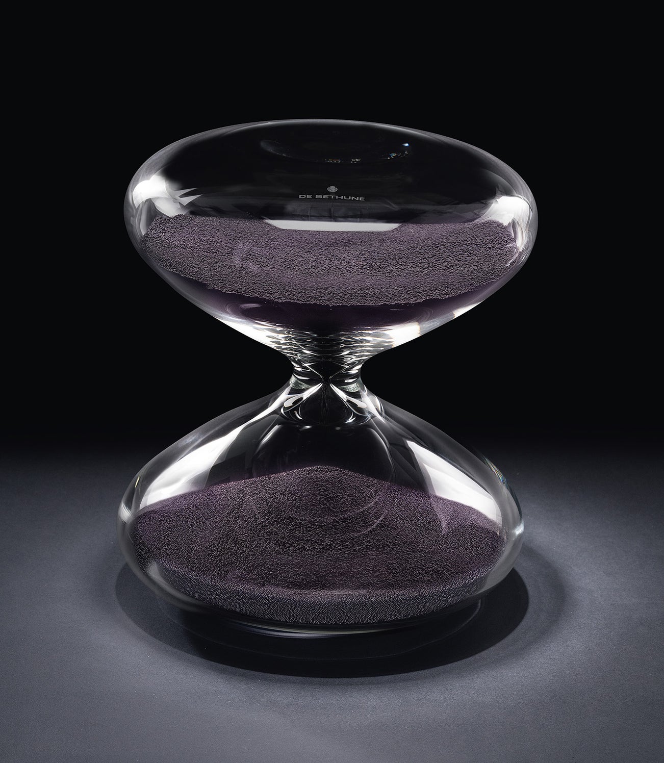 More a sculpture than a mere timekeeper, this unique hourglass features iconic heat-treated purple stainless steel nanoballs, a striking alternative to the usual metal coated nanoballs. This innovative color is derived from De Bethune’s exclusive techniques, similar to those found in their new D828xs Purple Rain. Additionally, this hourglass departs from the typical limited editions that measure 10 or 60 minutes; it records a duration of 20 minutes, in a new glass size.