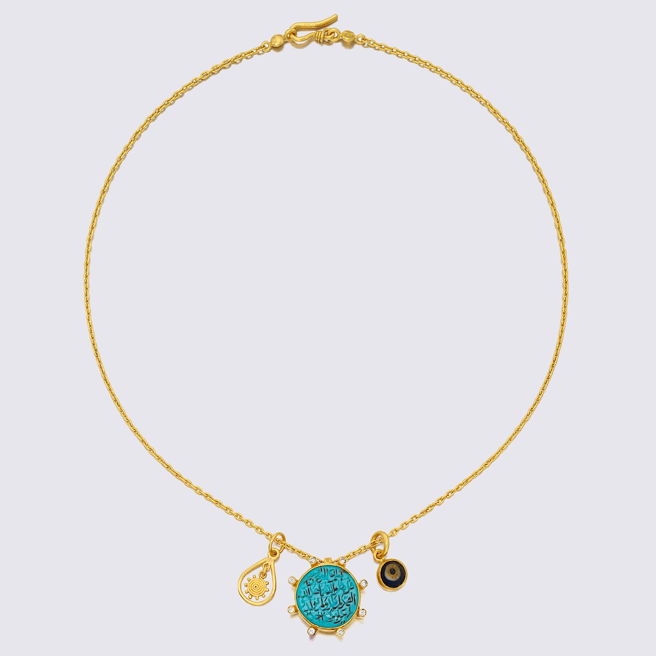 Comprising three pendants, one evil-eye pendant, one gold pendant and one set with a carved turquoise cabochon and decorated with circular-cut diamonds, mounted in 24K gold, chain length approximately 17 1/2 inches, signed HILAT, stamped 24.