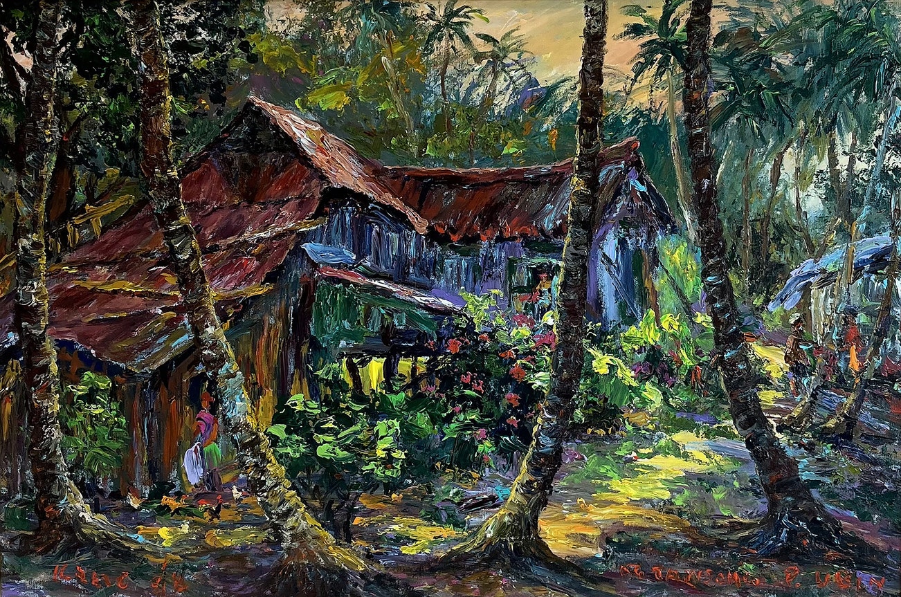 Specialising in oil painting, Ho Kah Leong is an amateur artist who has been active within the Singaporean art scene for more than six decades. In Morning Sun, Ho captures the charm and serenity of Malay kampongs using vivid colours and bold brushstrokes reminiscent of the Impressionist masters.