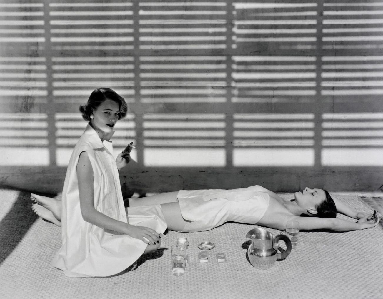 "This is one of the first photographs that I took at my house in Oyster Bay. The house was not even finished but [Vogue art director] Alex Liberman thought that, even so, it was a good place for taking photographs. The girls are modeling bathing suits and summer dresses. I always loved sunlight and shadow and straw mats." - Horst P. Horst
