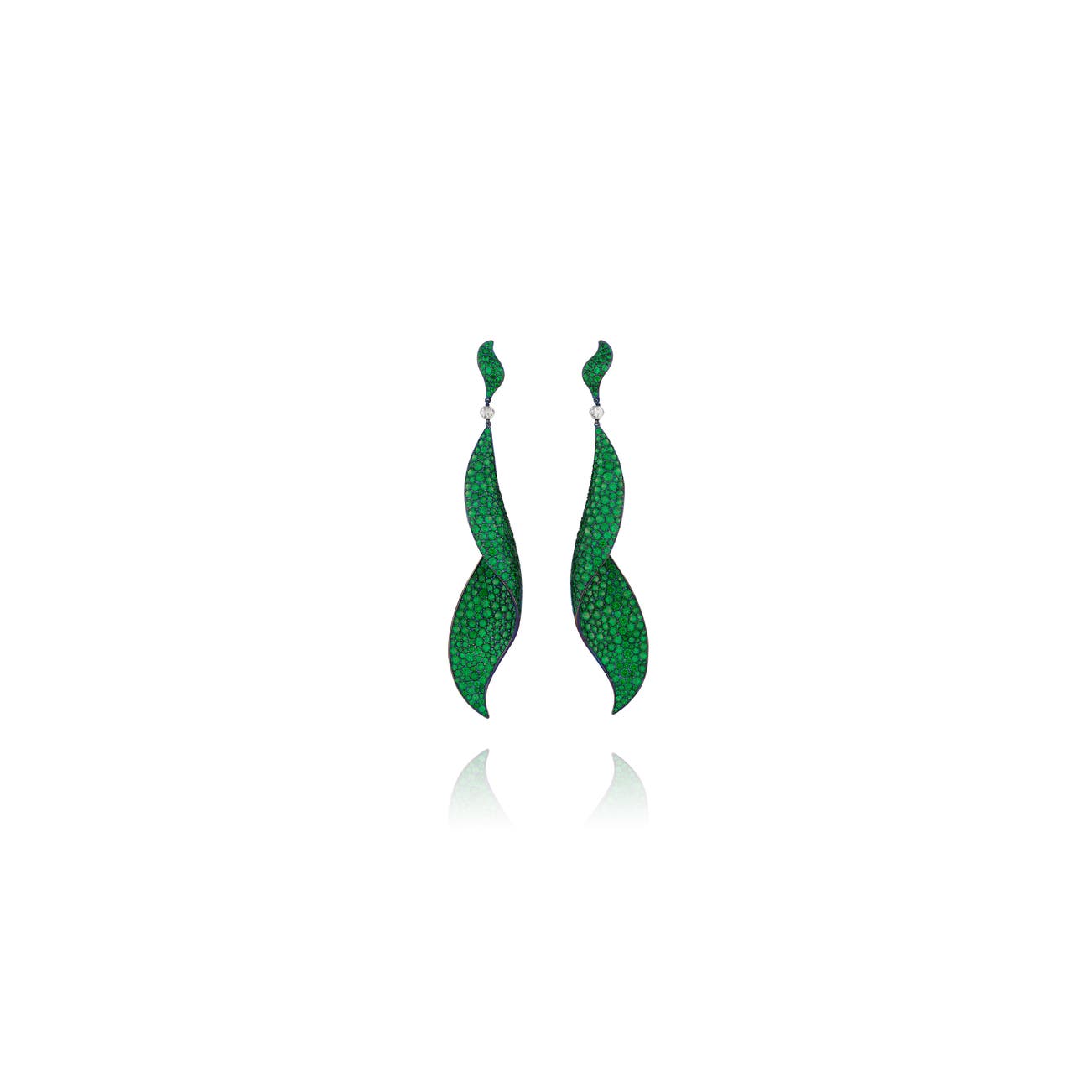 Each set throughout with circular-cut emeralds and tsavorite garnets, accented with a briolette diamond, mounted in titanium, length approximately 105mm, foldable post and hinged-back fittings, fitted case.